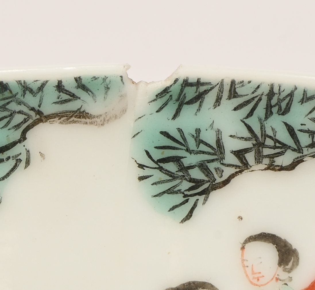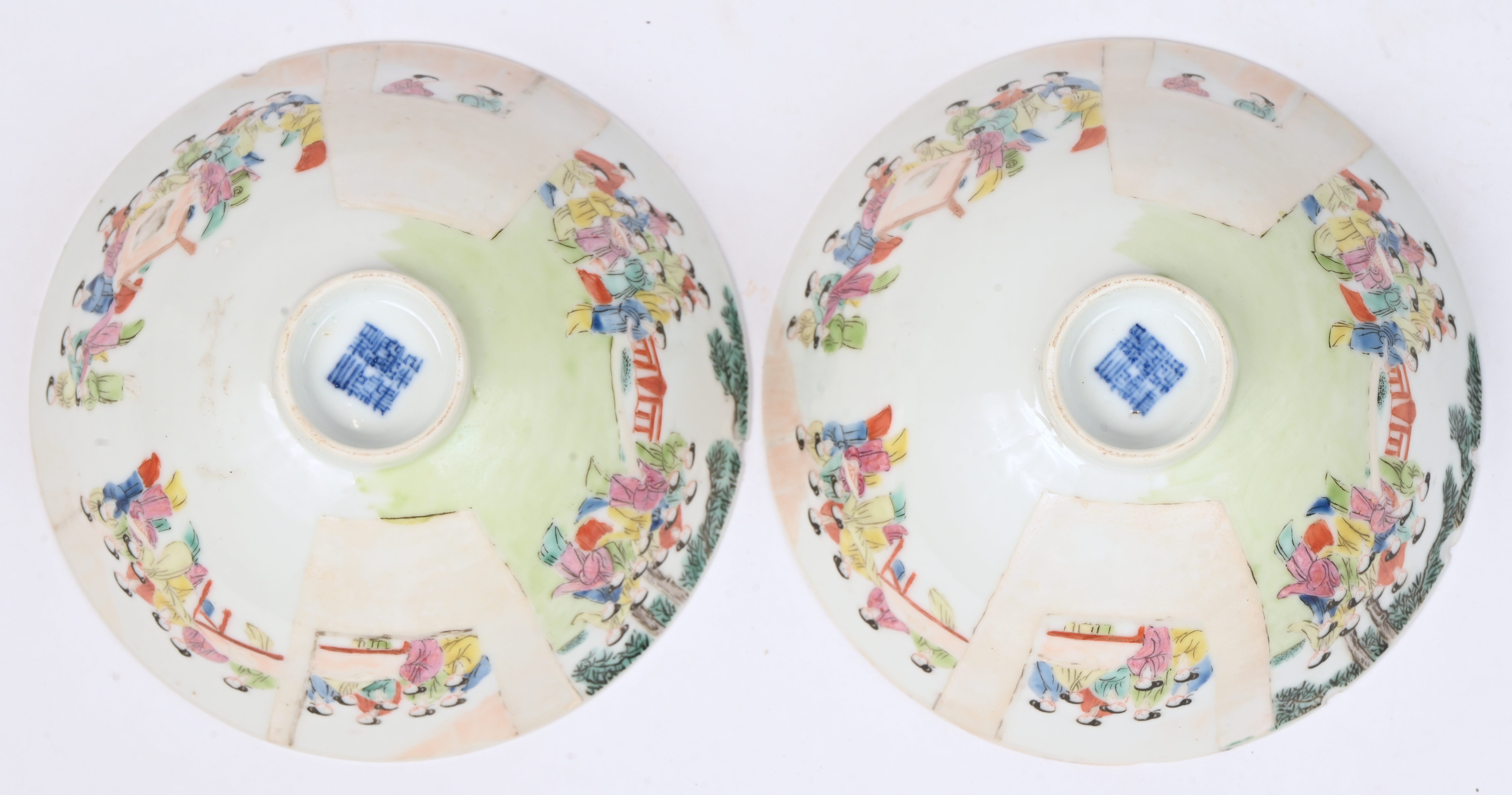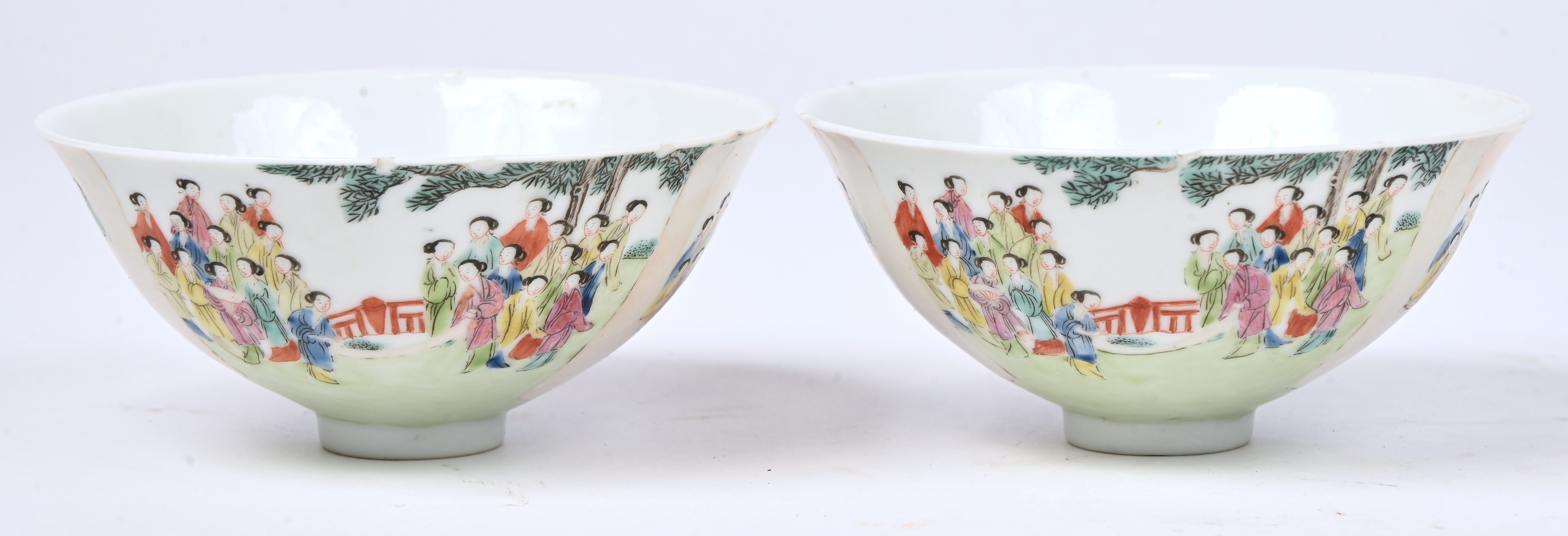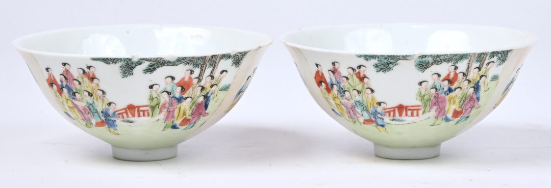 Een paar Chinees porseleinen kommetjes rondom versierd met talrijke famille rose personages, onderaan gemerkt Da Qing Qianlong Nian Zhi. Tweede helft XXste eeuw. Randschilfers aan beide.