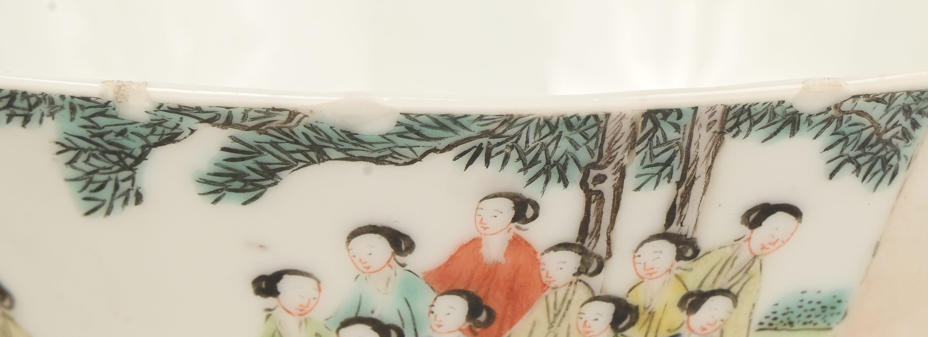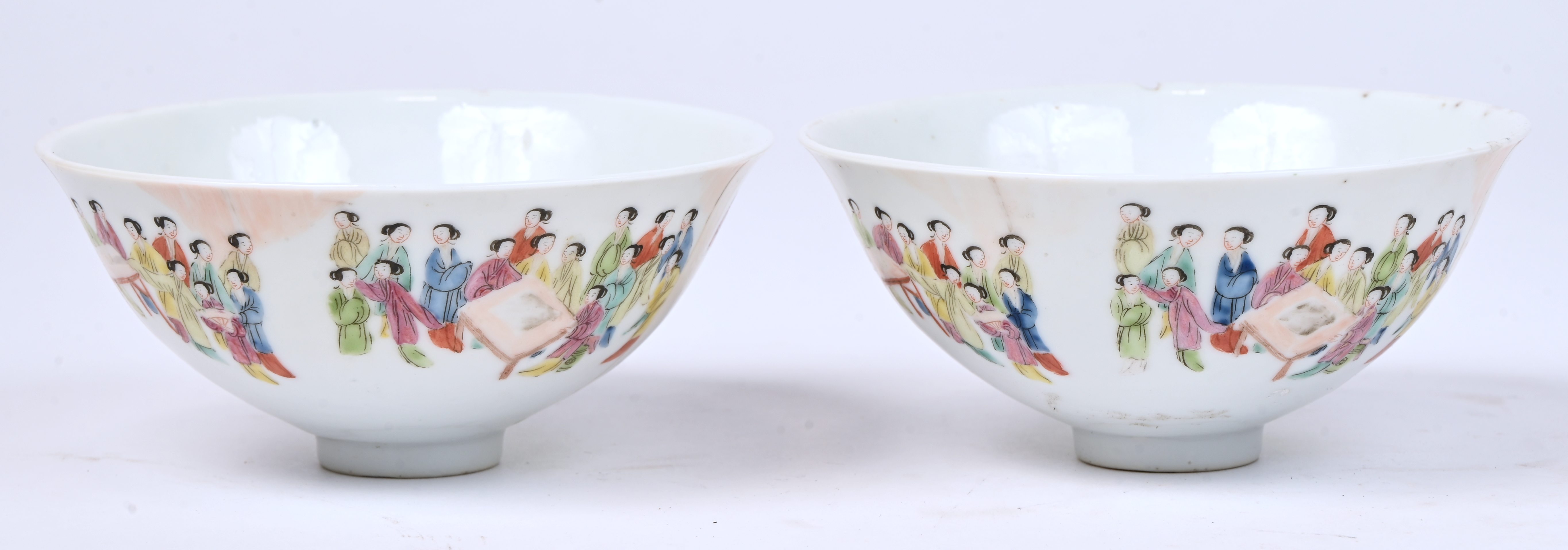 A pair of Chinese porcelain bowls decorated around the exterior with numerous famille rose figures, marked on the underside Da Qing Qianlong Nian Zhi. Second half of the 20th century. Rim chips to both.