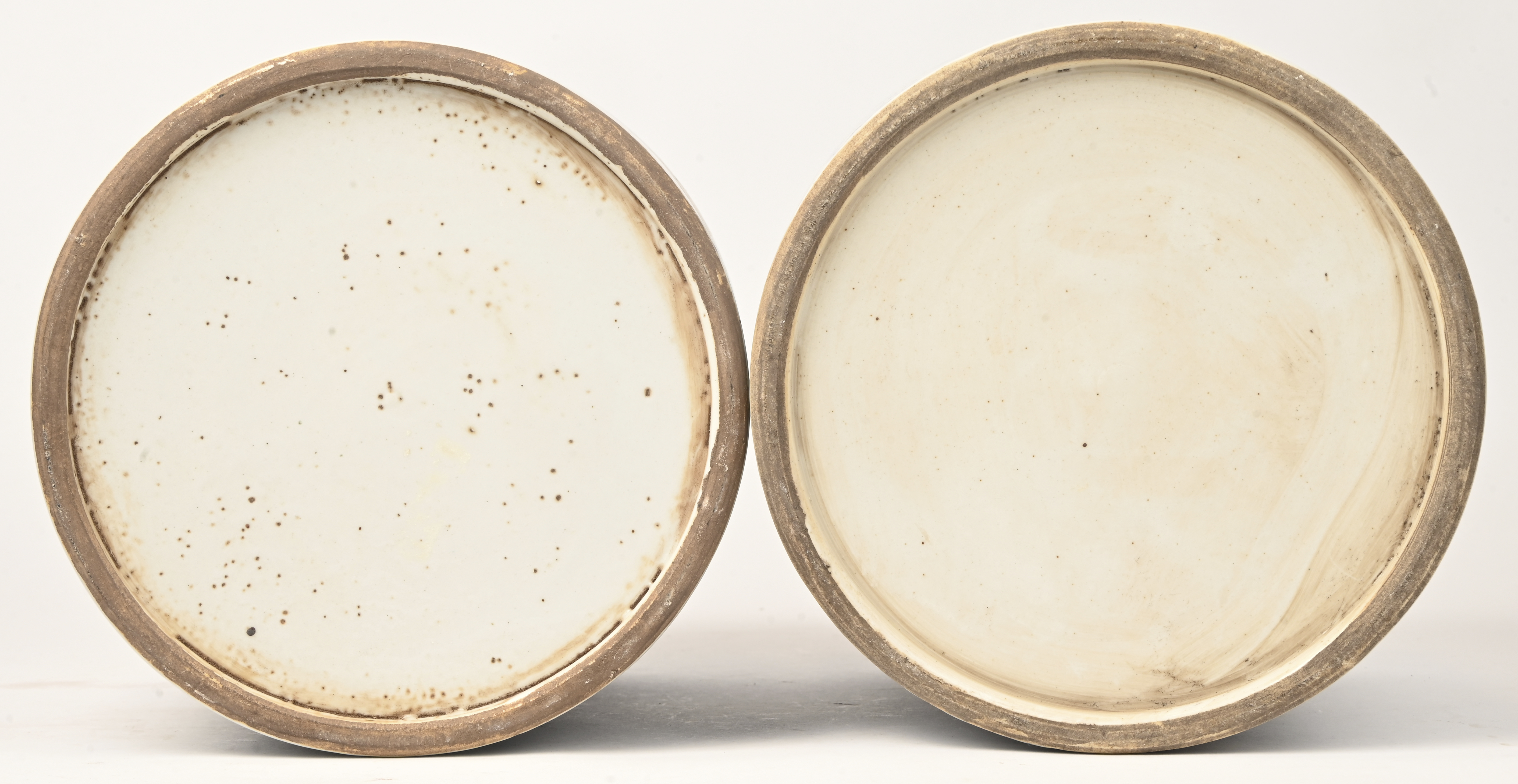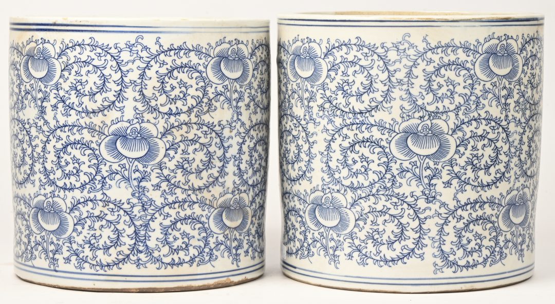 Een paar cilindervormige potten van Chinees porselein met een blauw op wit floraal decor.