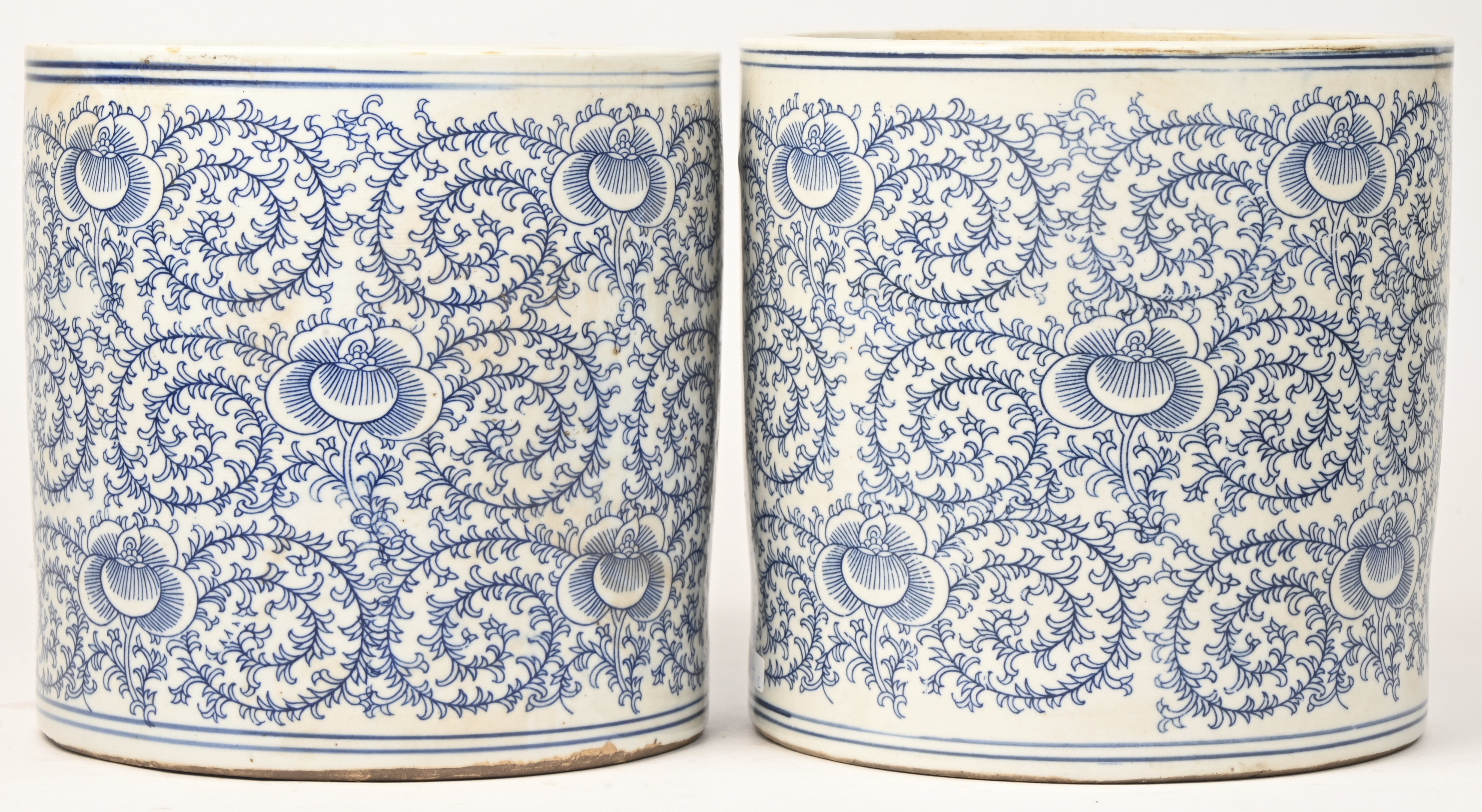 A pair of cylindrical pots of Chinese porcelain with a blue on white floral decoration.