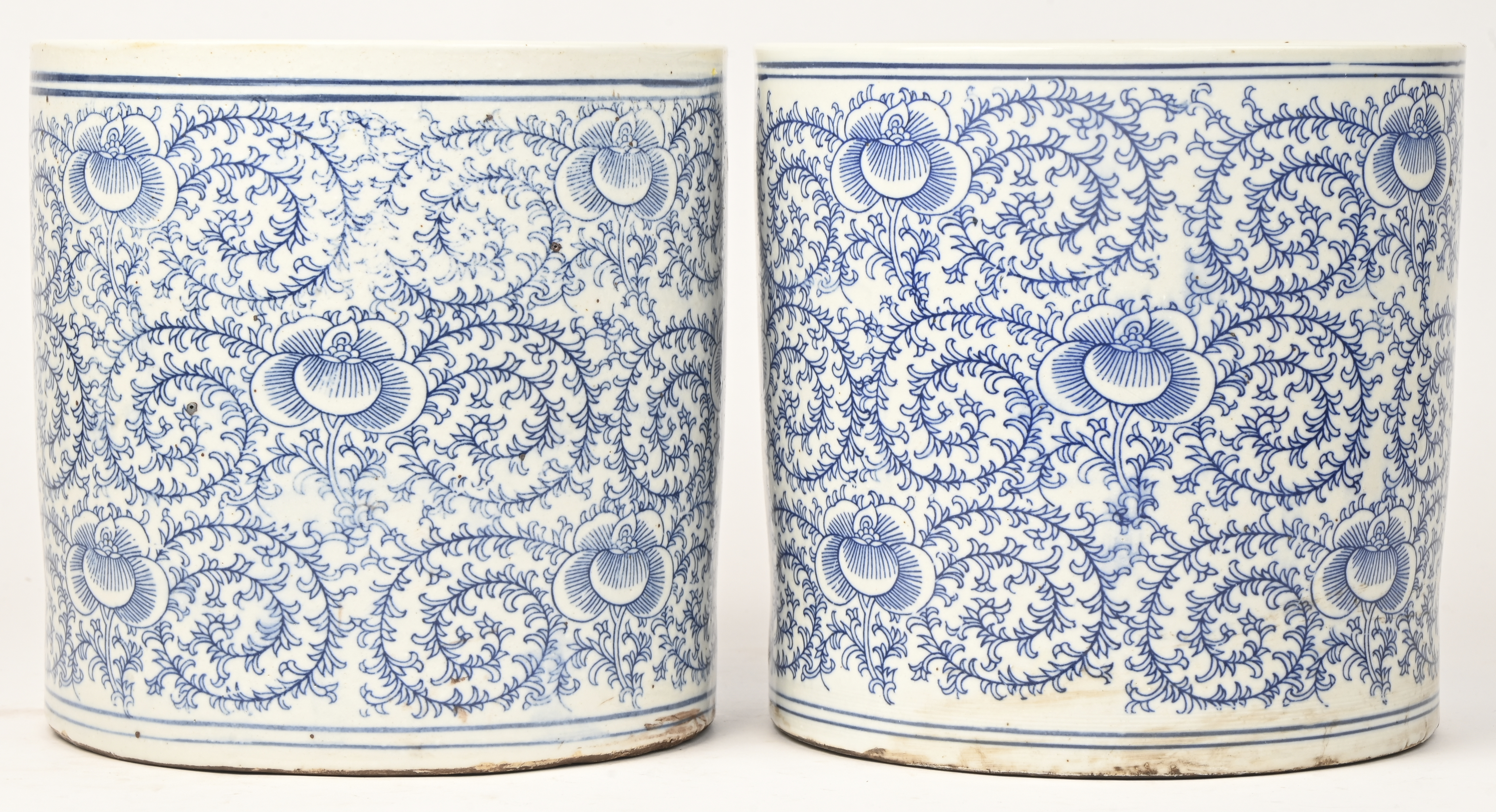 A pair of cylindrical pots made of Chinese porcelain with a blue on white floral decoration.