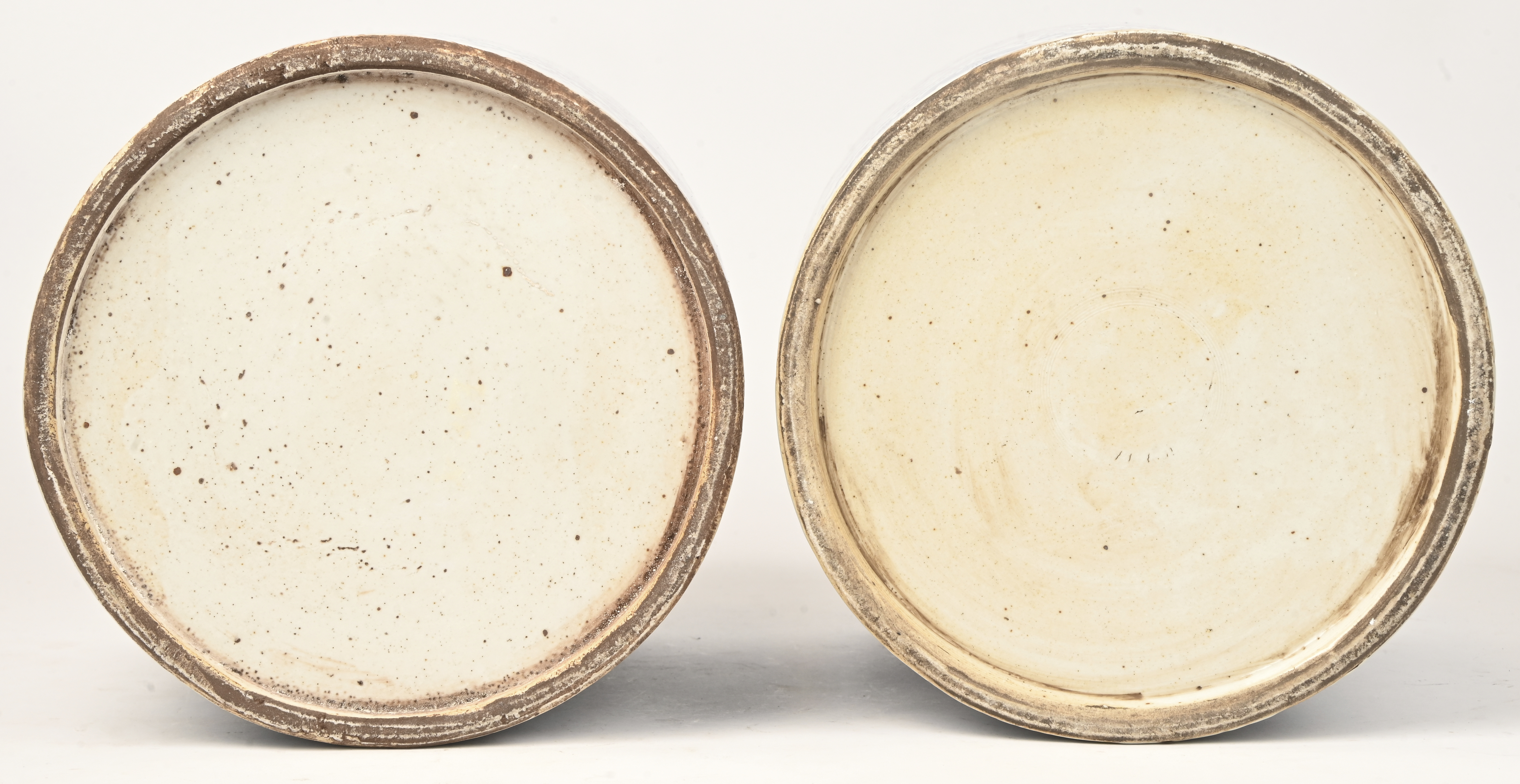 Een paar cilindervormige potten van Chinees porselein met een blauw op wit floraal decor.
