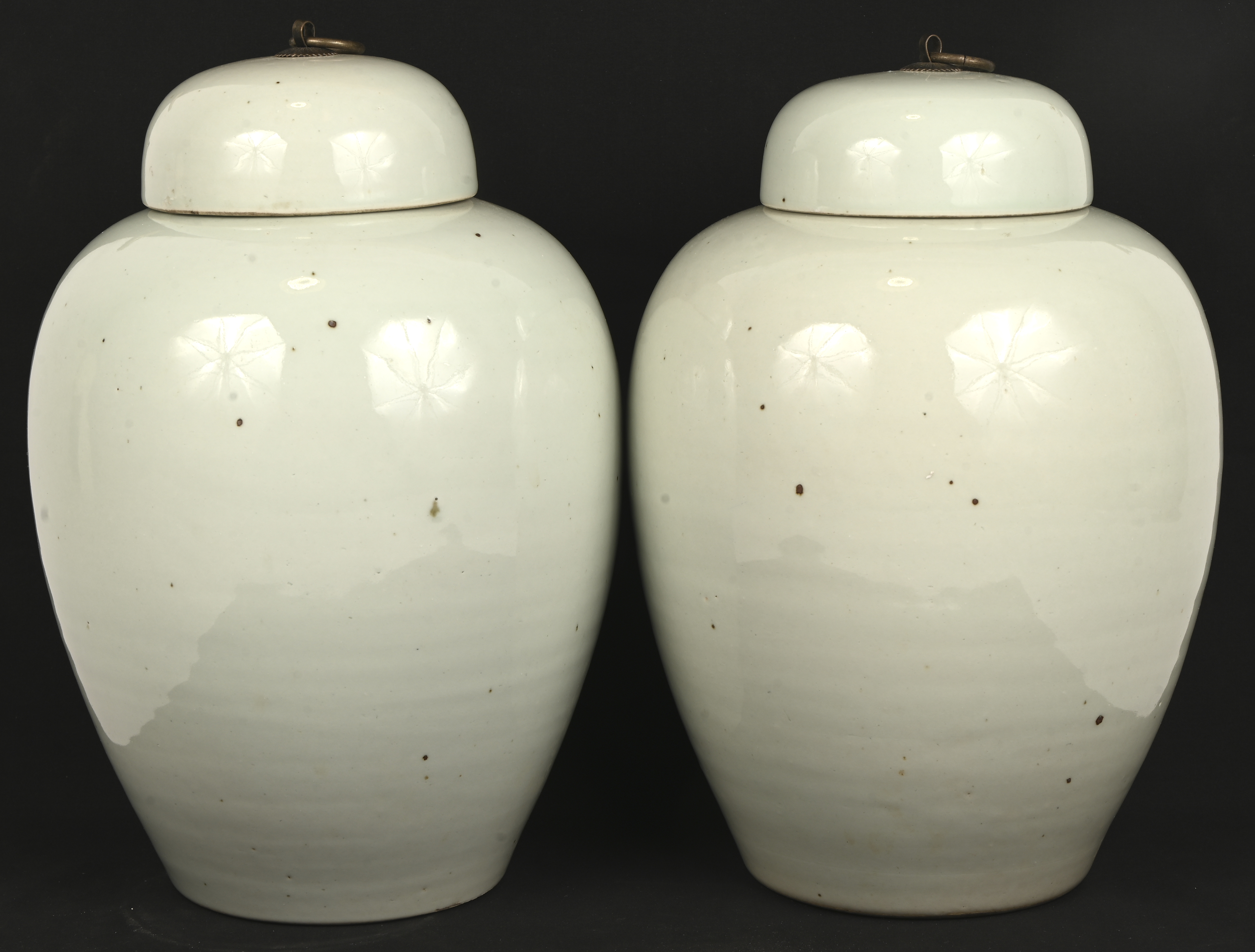 A pair of ginger jars made of blue and white porcelain, decorated with symbols of longevity. With porcelain lids. -