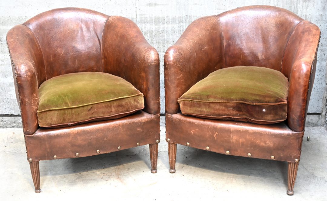 A set of two large chalices made of colorless crystal with an engraved decoration of wine leaves. Marked with a sticker, one chalice is signed.No longer availableDim. Hoogte 26 cmEstimate: € 100 / 150 -