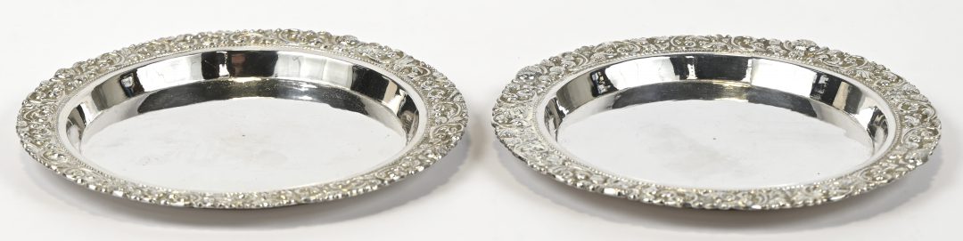 A pair of silver bottle coasters with embossed floral frieze. Indonesian work. 295 g AR28-30.