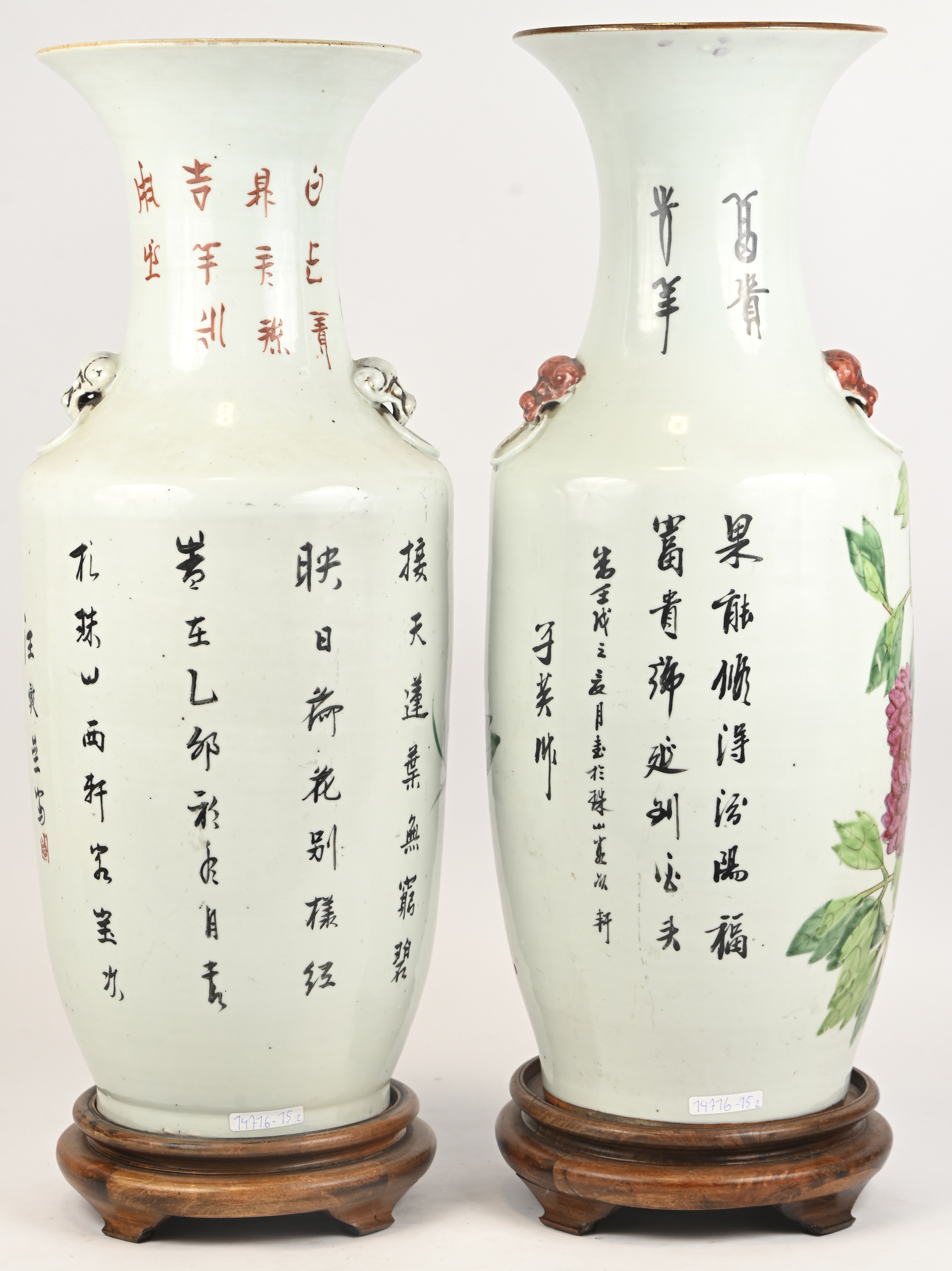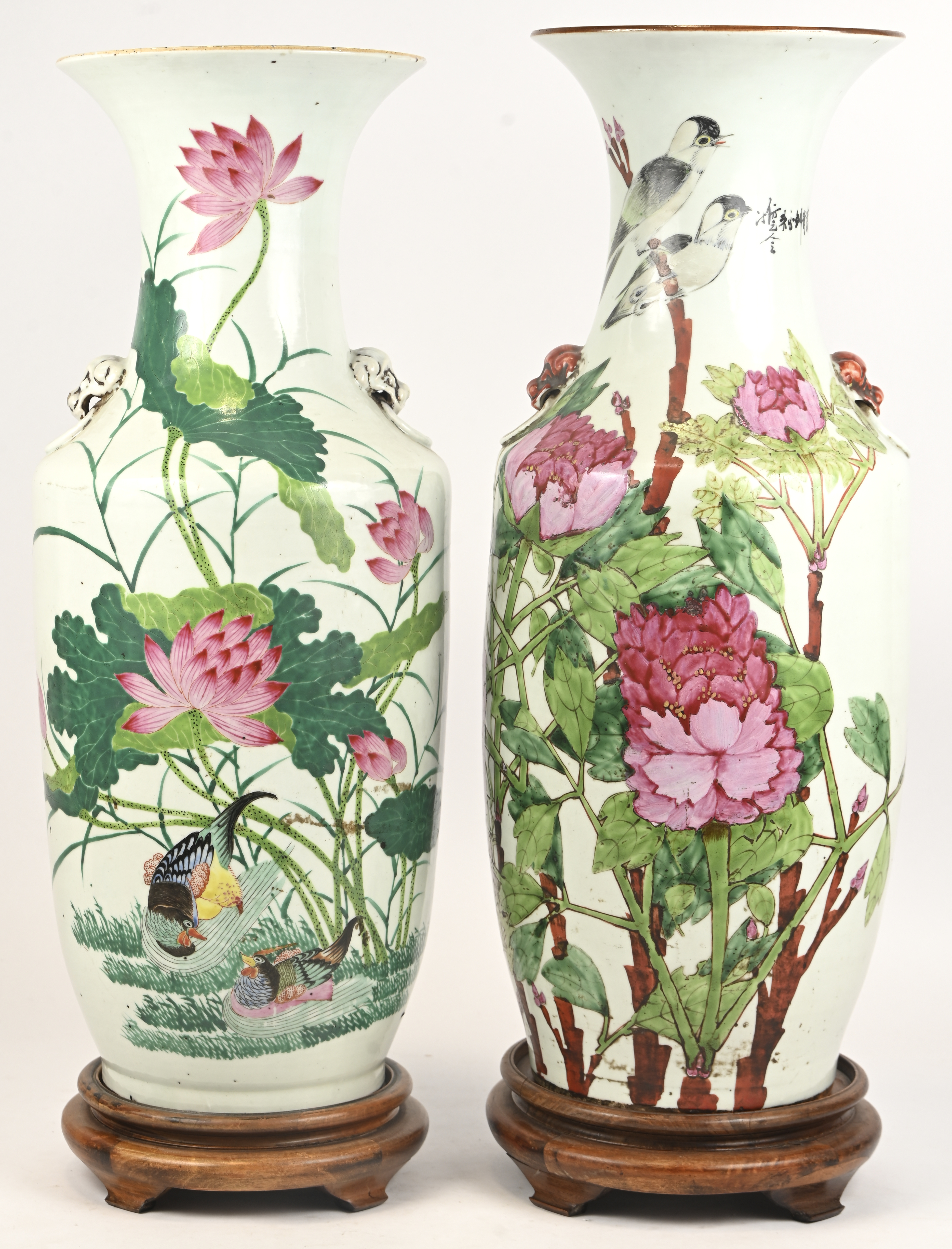 Een paar grote Chinese qianjiang cai vazen met een decor van vogels en planten, Fu-leeuwen als handvatten en tekst op de achterzijde, 19/20e eeuw. Met houten sokkels.