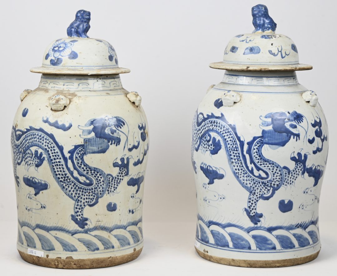 A set of 2 Chinese porcelain covered vases. Decorated with a blue and white design of birds and flowers, with the lid adorned with Fu dogs.No longer availableDim. h 48 cmEstimate: € 150 / 250 -