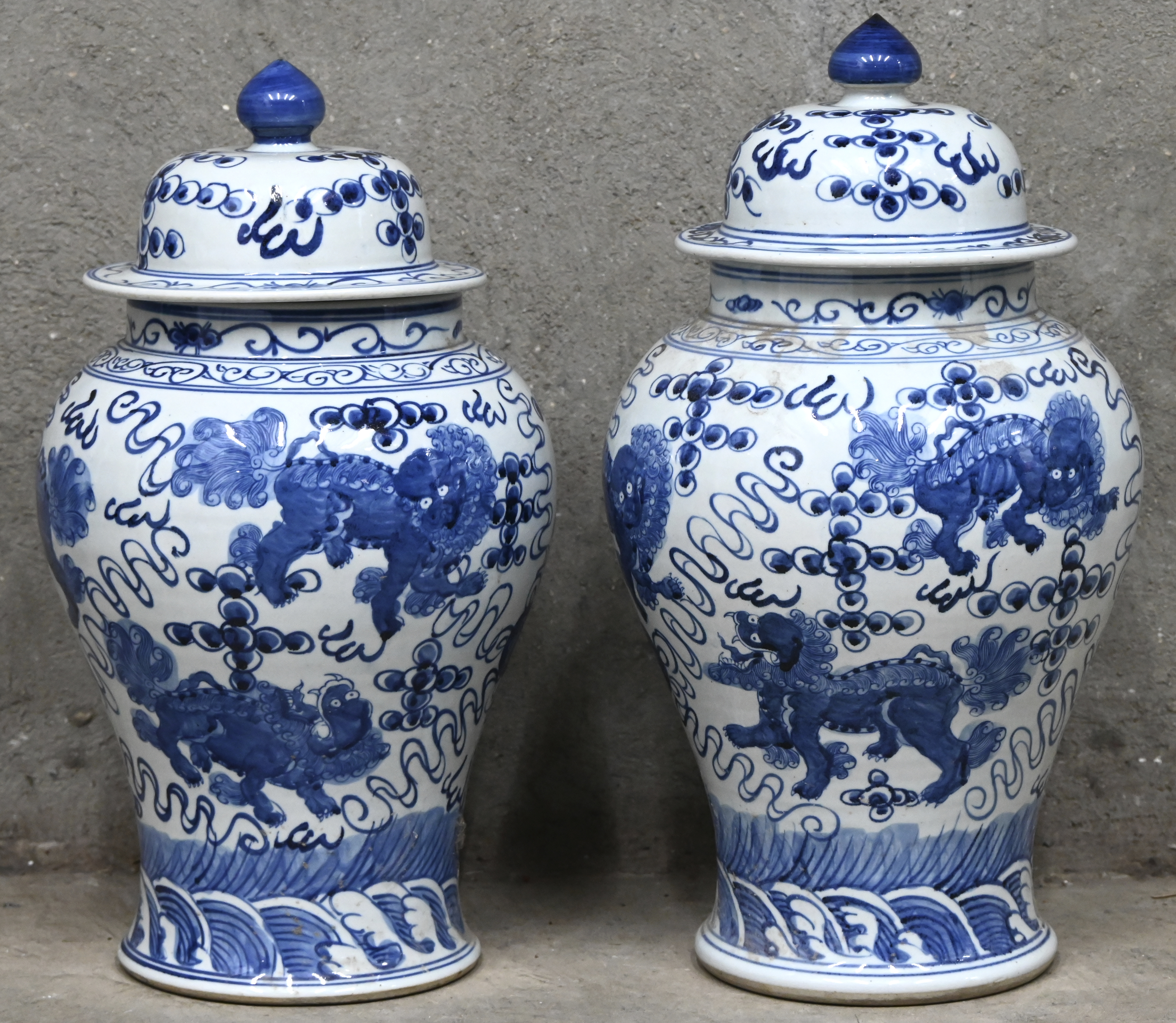 #433Een paar grote dekselvazen van blauw-wit geglazuurd Chinees aardewerk. Met een decor van draken.