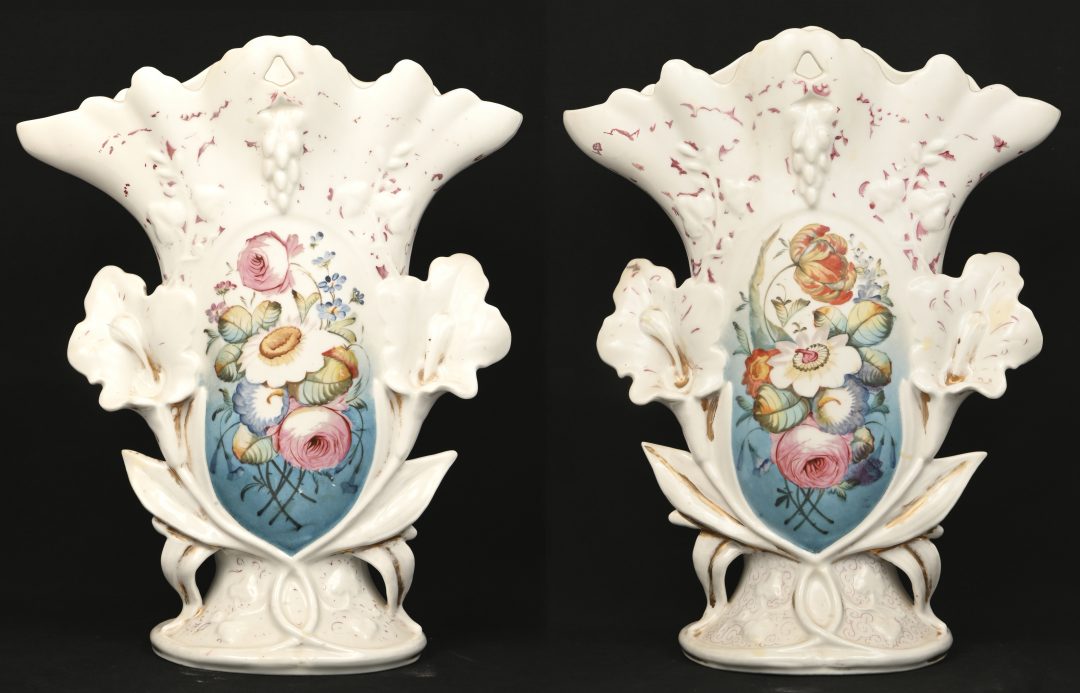 #77Een paar grote hoornvazen van Brussels porselein met een meerkleurig bloemendecor en vergulde motieven. Omstreeks 1900. Kleine schade.