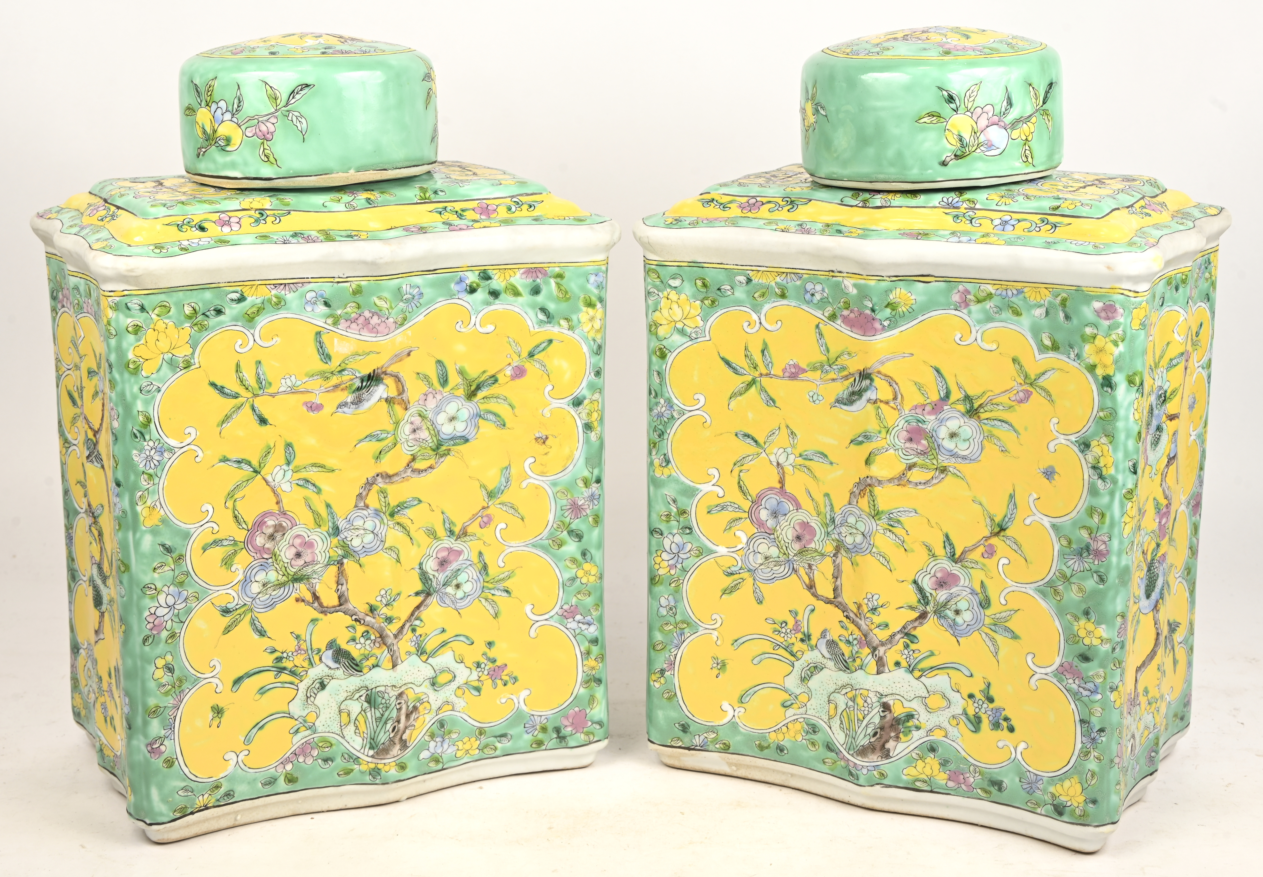 #388Een paar hoge gemberpotten van blauw-wit geglazuurd Chinees porselein. Met de symbolen voor een lang leven en een floraal decor. Schilferschade aan de dekselknoppen.