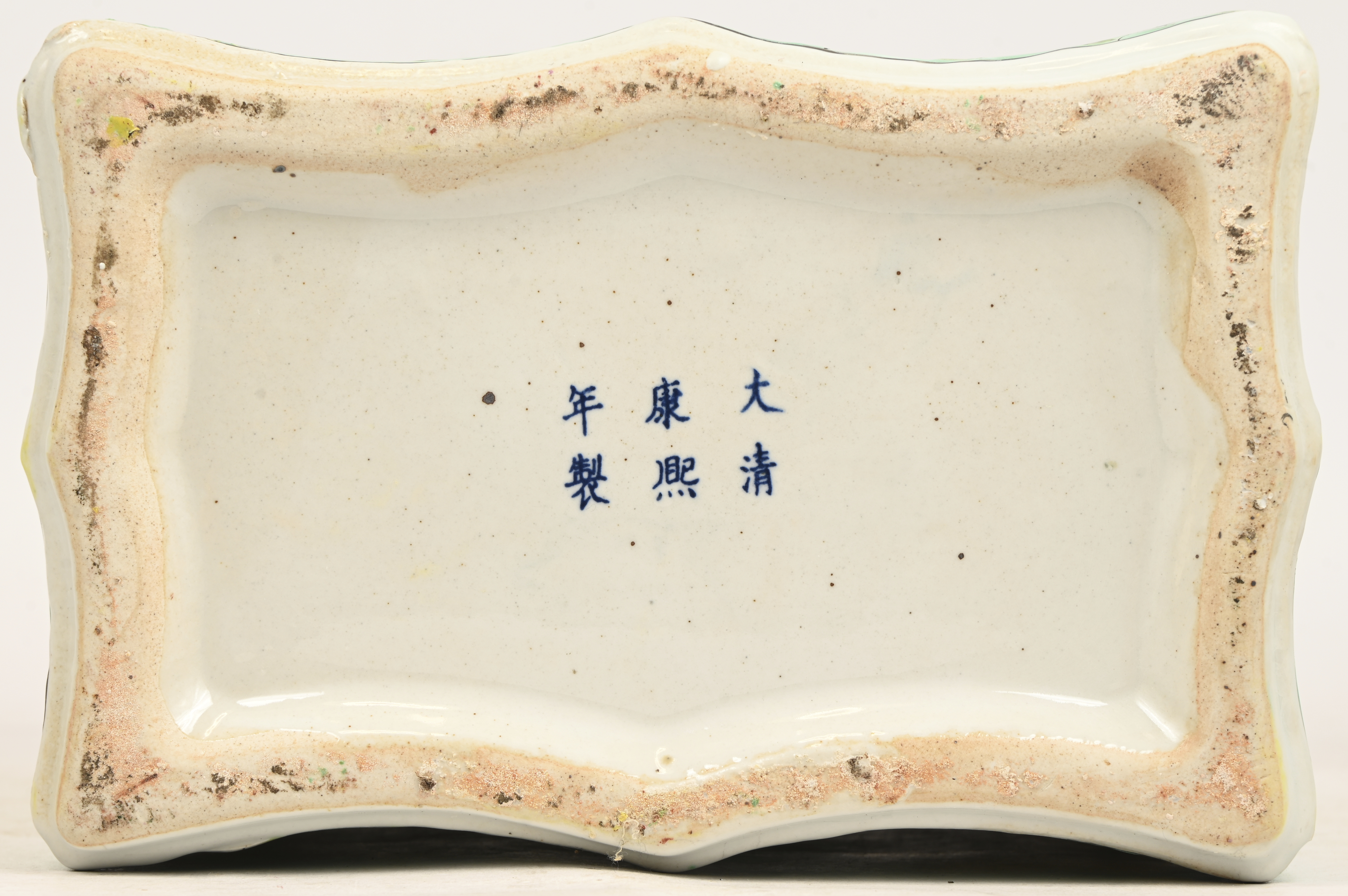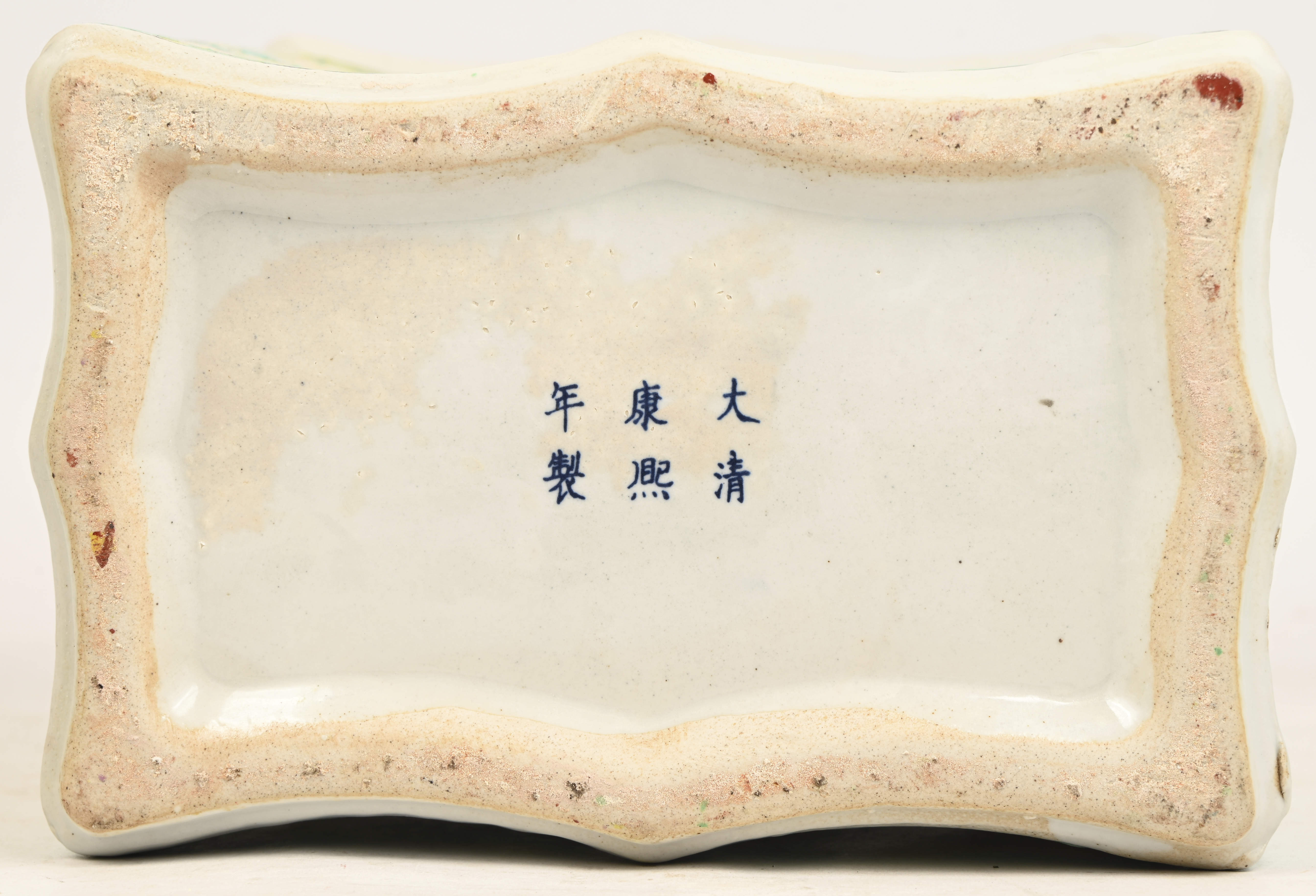 #27Een hoorn des overvloeds uit brons en porselein, met mythologische figuren gedecoreerd, gemerkt.