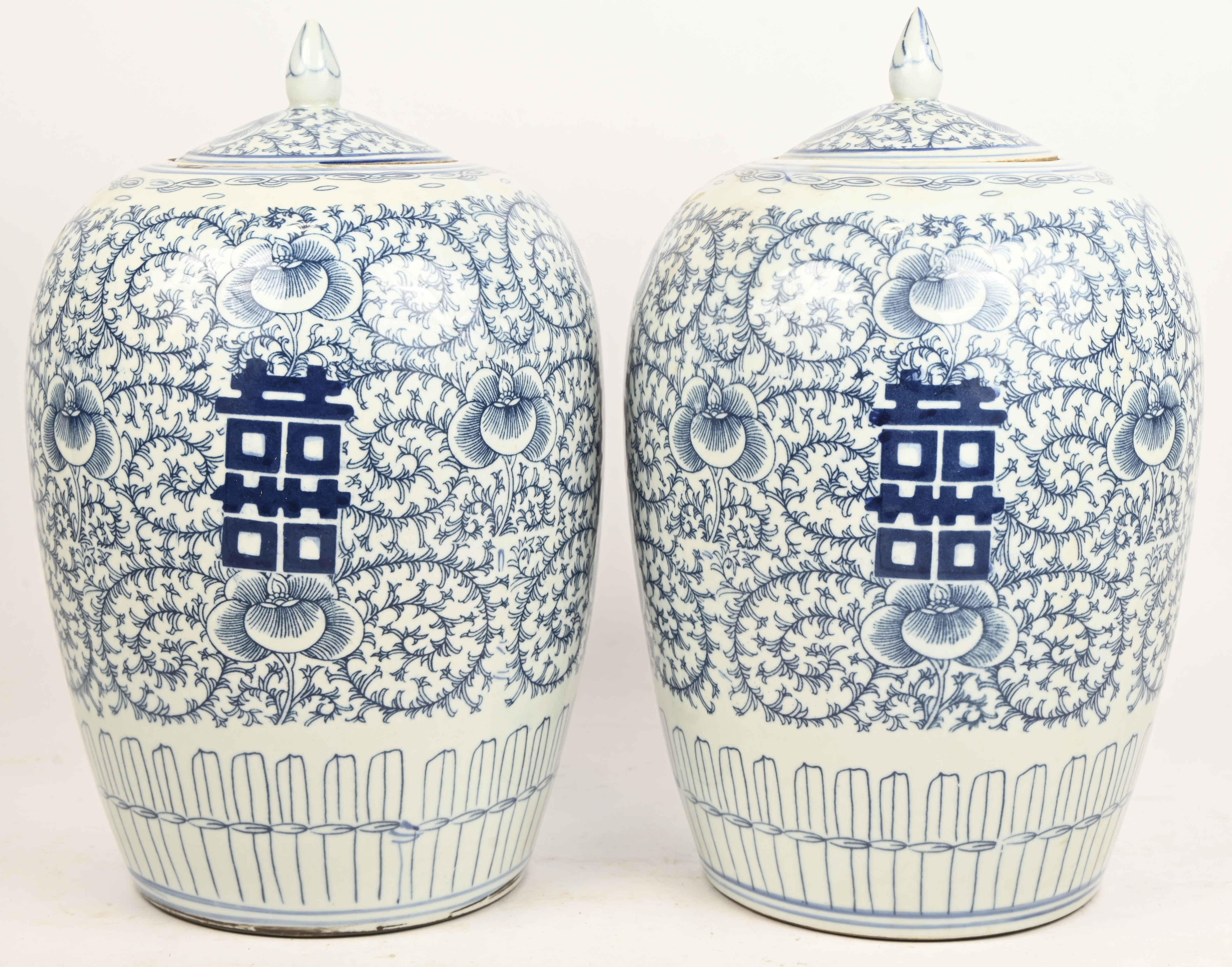 #381Een paar gemberpotten van blauw en wit porselein, met lang levensymbolen. Met porseleinen deksels.
