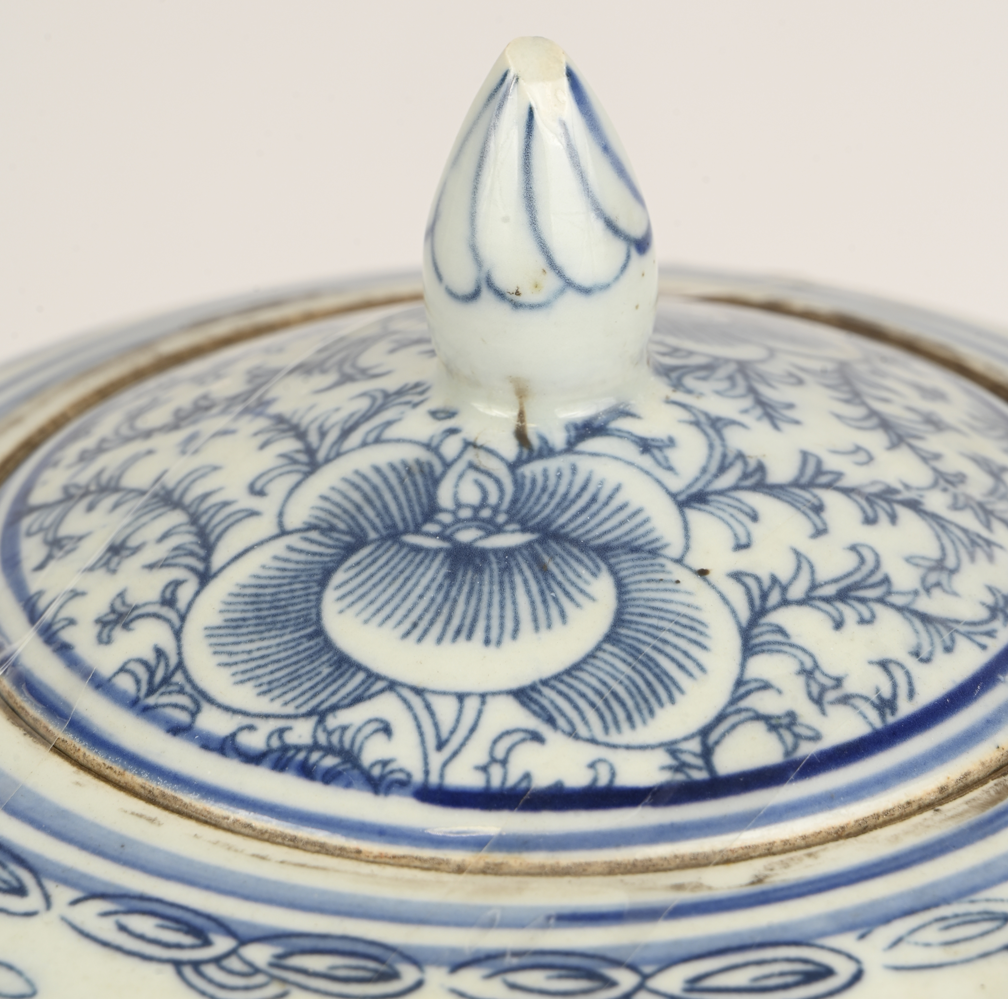 #411Een grote voorraadpot van blauw-wit geglazuurd Chinees aardewerk, met Wanli decor.