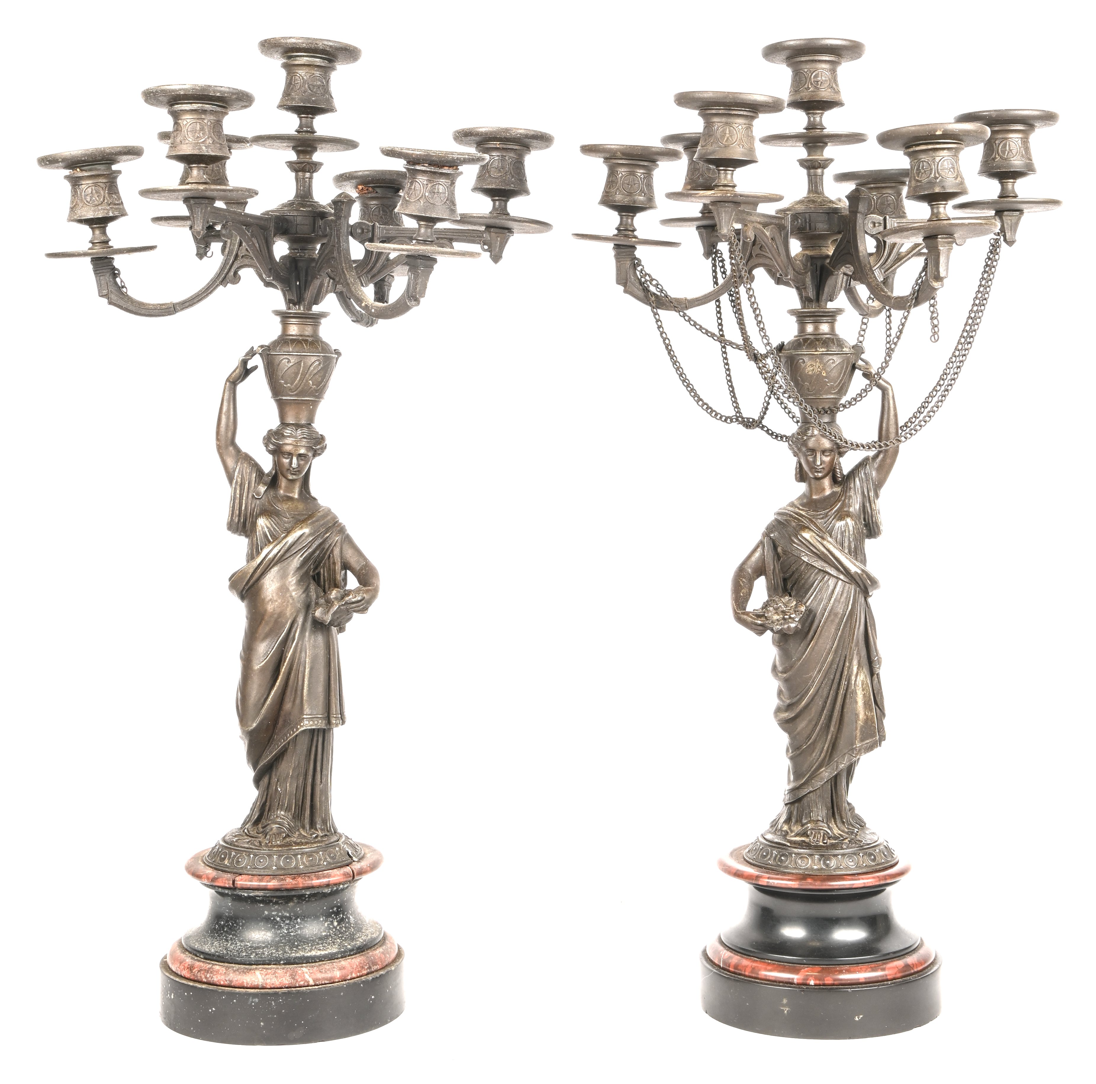 A pair of polychrome porcelain and biscuit figurines. Depicting a woman with a basket of flowers and a man with a large empty basket. Marked at the bottom, possibly Kiyelka, first quarter of the 20th century. Tiny repair on a flower.No longer availableDim. H. 34 cmEstimate: € 200 / 220 -