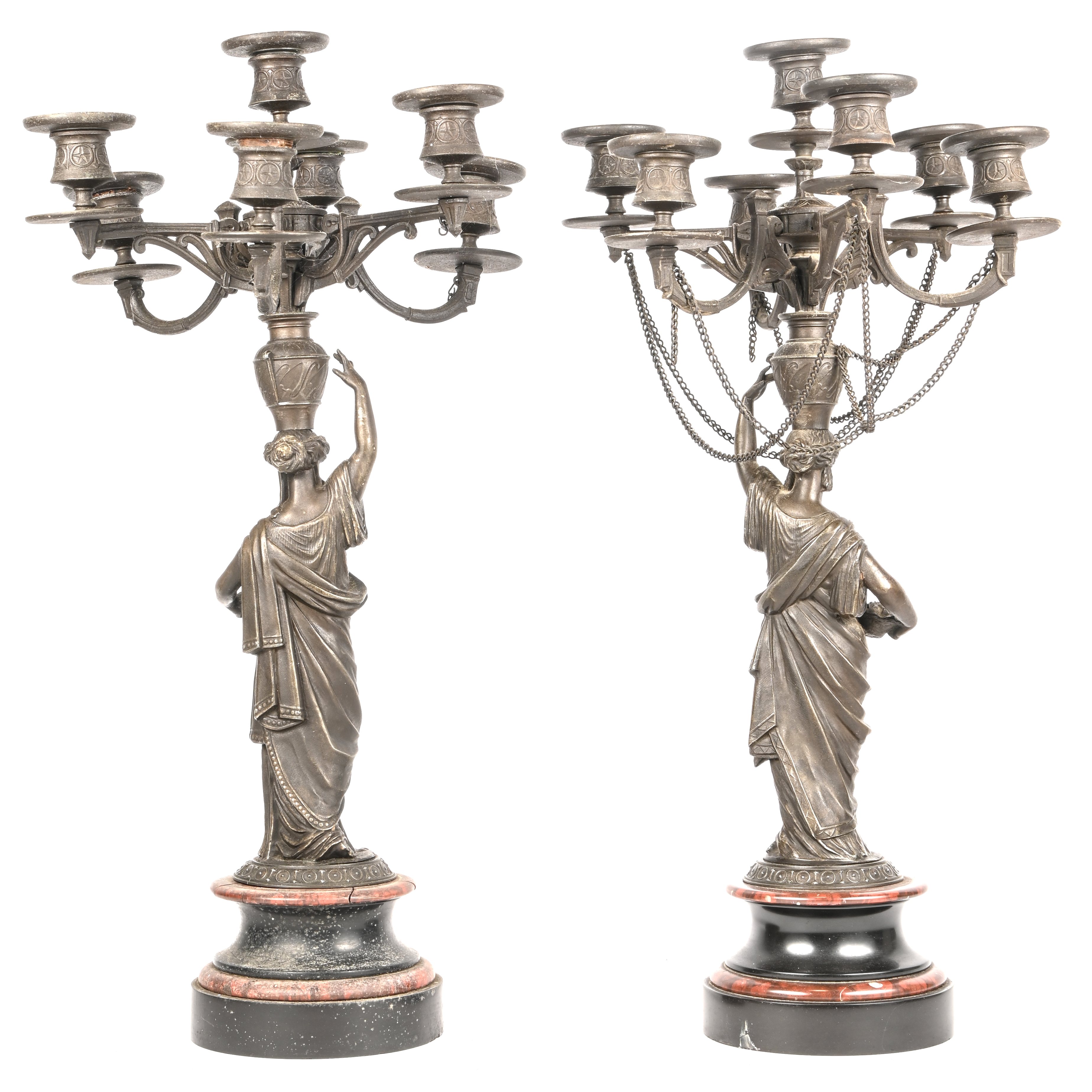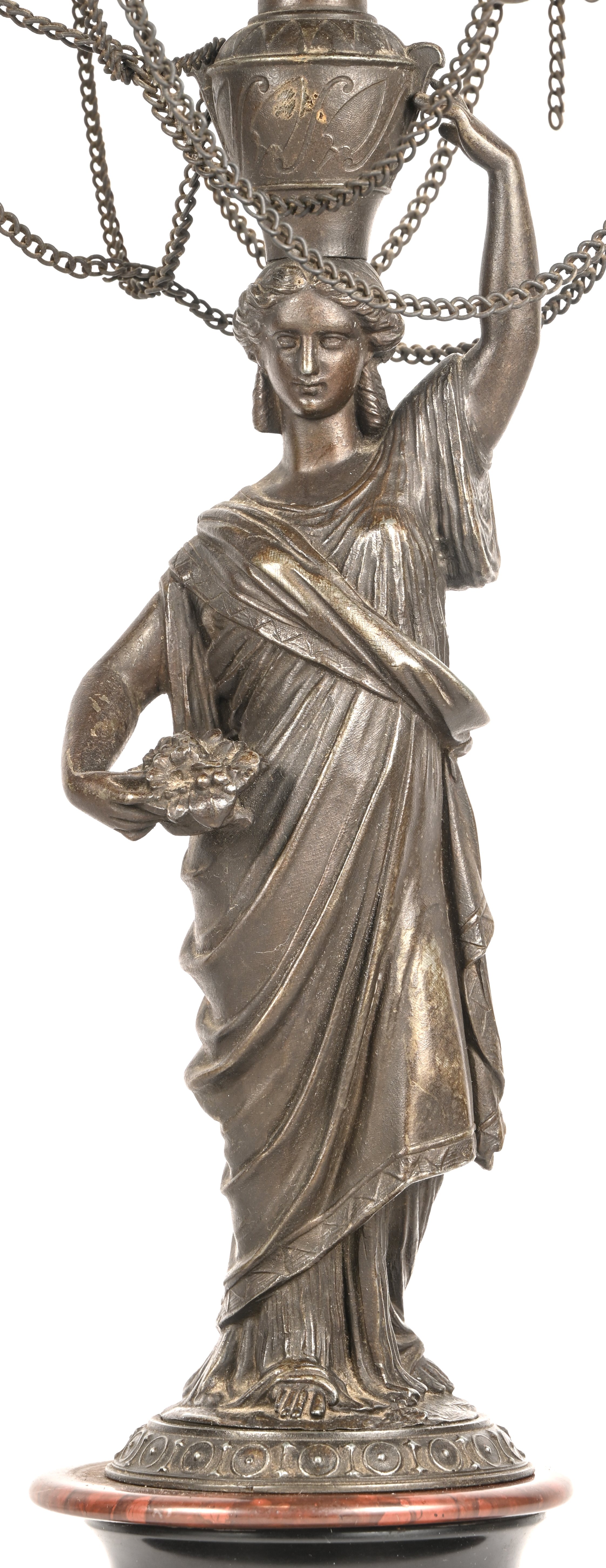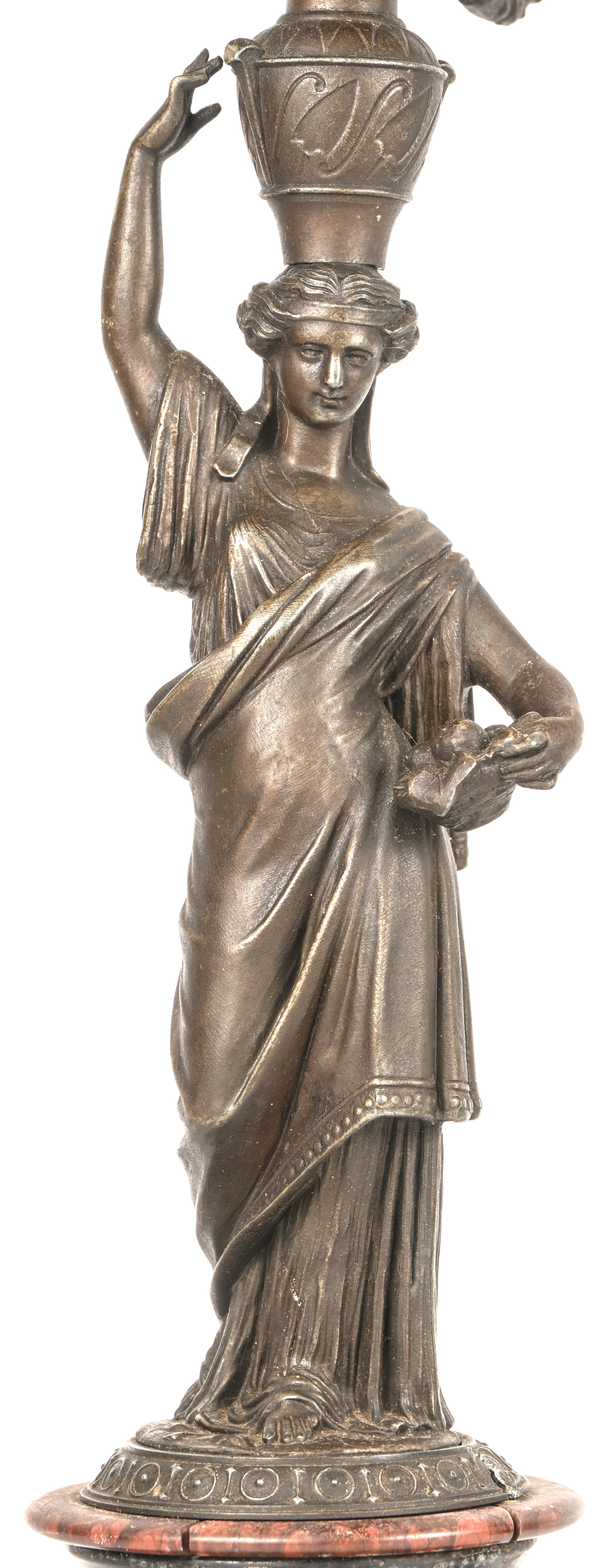 Een zuil van monochroom beige aardewerk met een reliëfdecor van personages naar de Griekse oudheid.