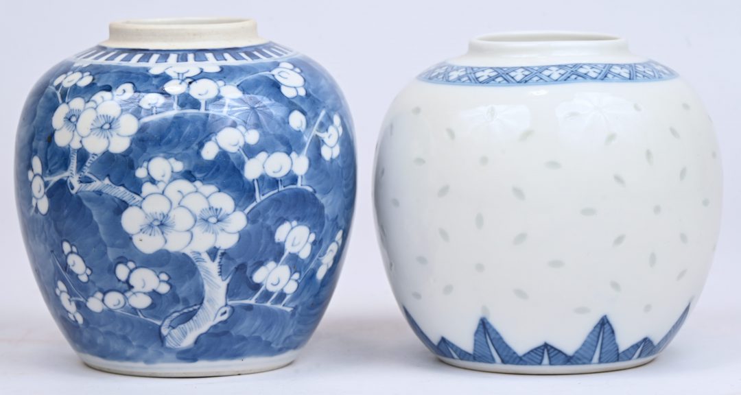 Een paar kleine gemberpotten van Chinees porselein met een blauw op wit decor. Zonder deksels.