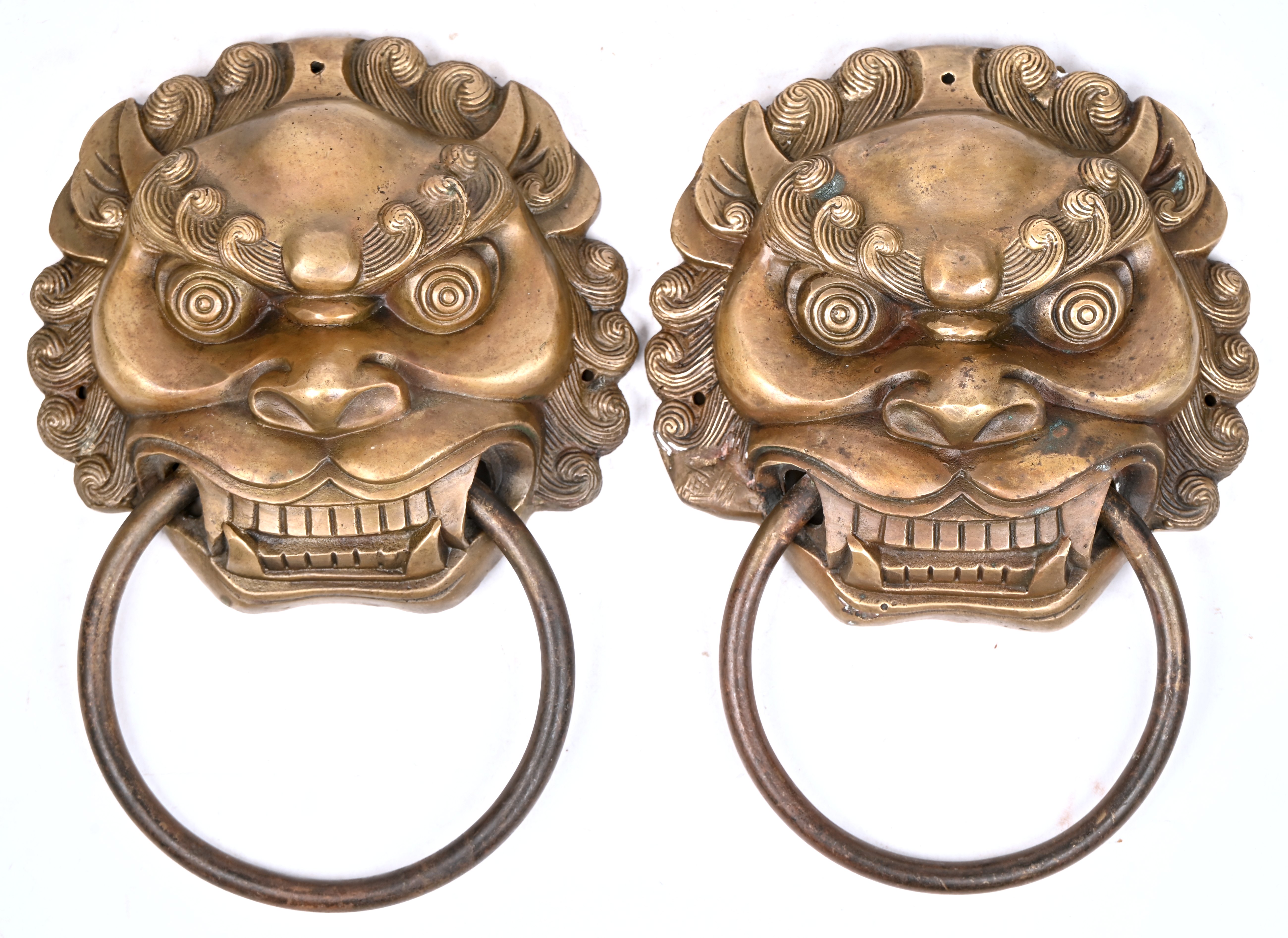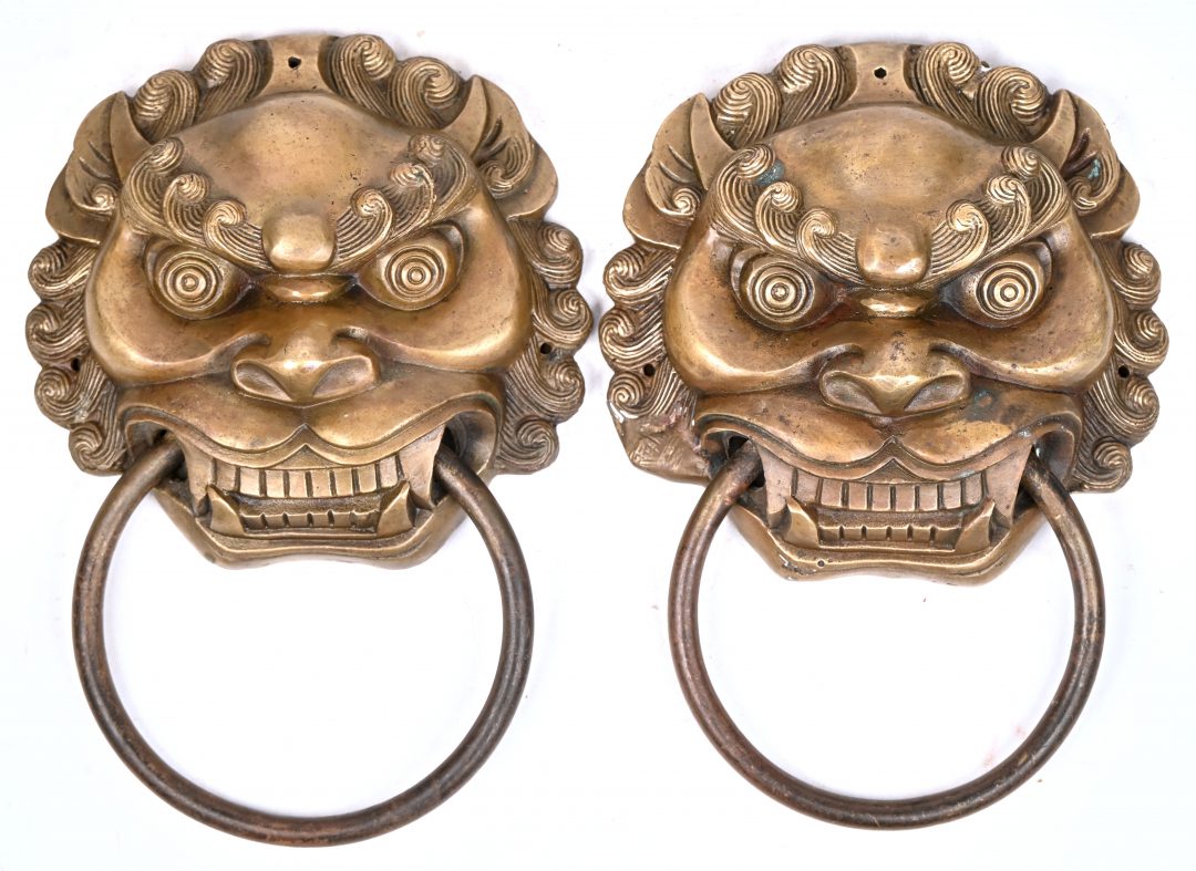 Een paar koperen deurtrekkers gevormd als Aziatische leeuwenkoppen.