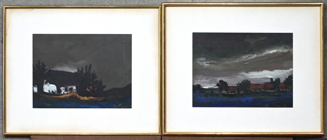 A lot of two naive paintings, farmhouse view at dusk and rural interior, acrylic on paper. Signed. -
