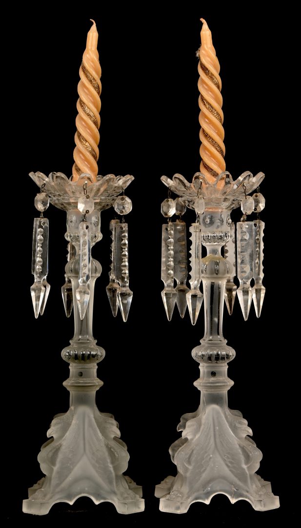 A pair of pressed glass candlesticks, Griffon model, Luxval. With wax catchers.