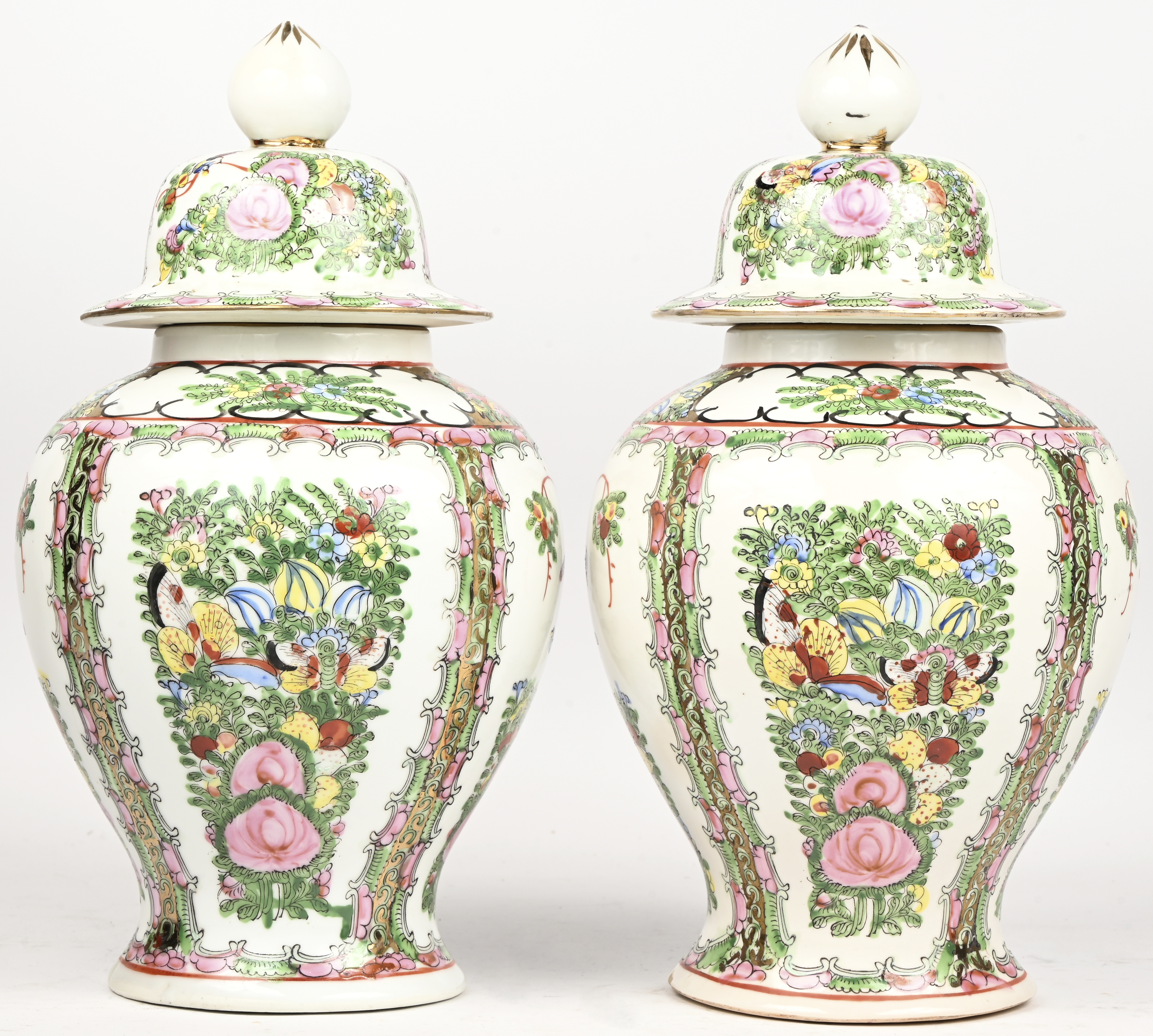 A set of 2 Chinese porcelain covered vases. Decorated with a blue and white design of birds and flowers, with the lid adorned with Fu dogs.No longer availableDim. h 48 cmEstimate: € 150 / 250 -
