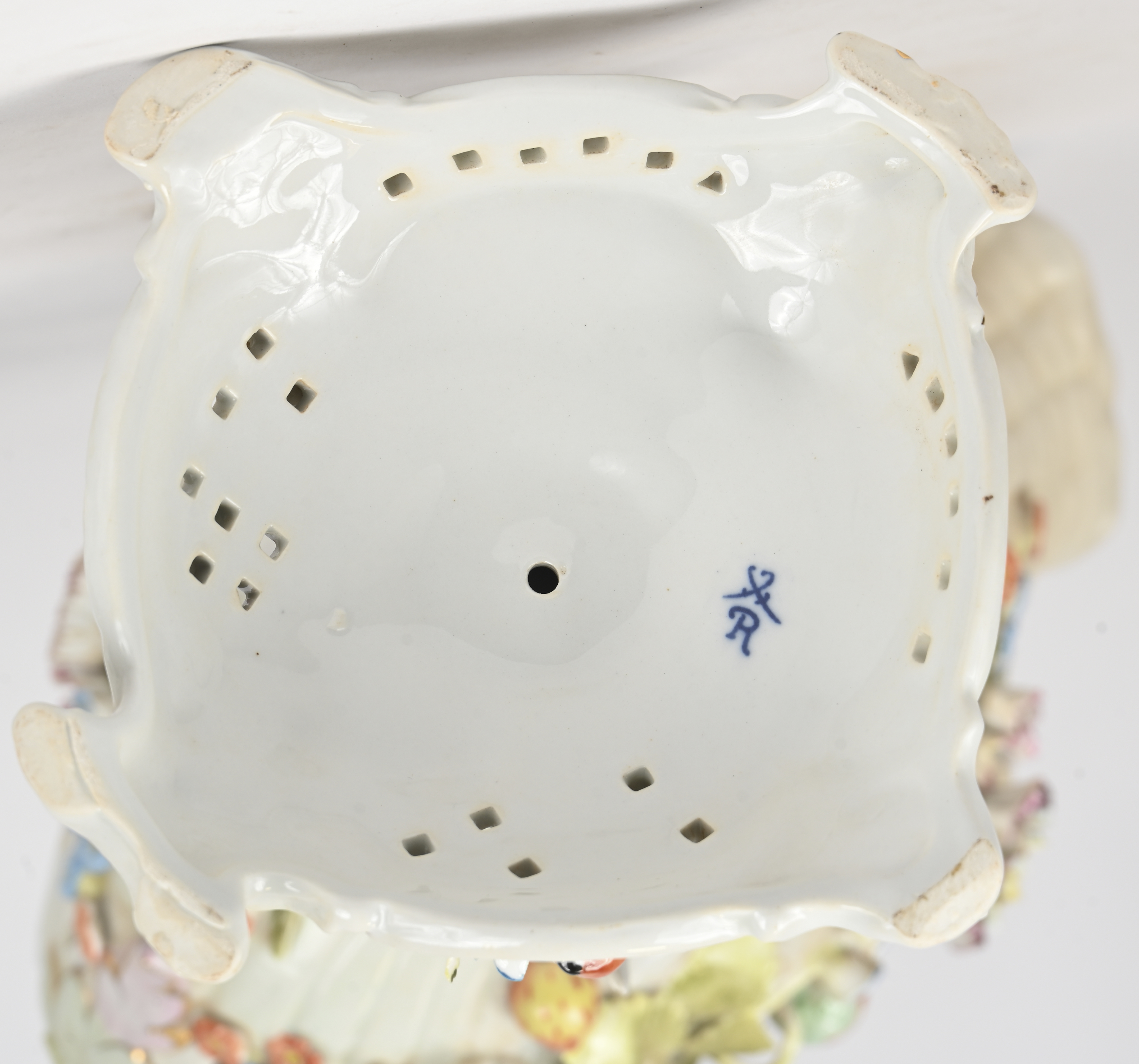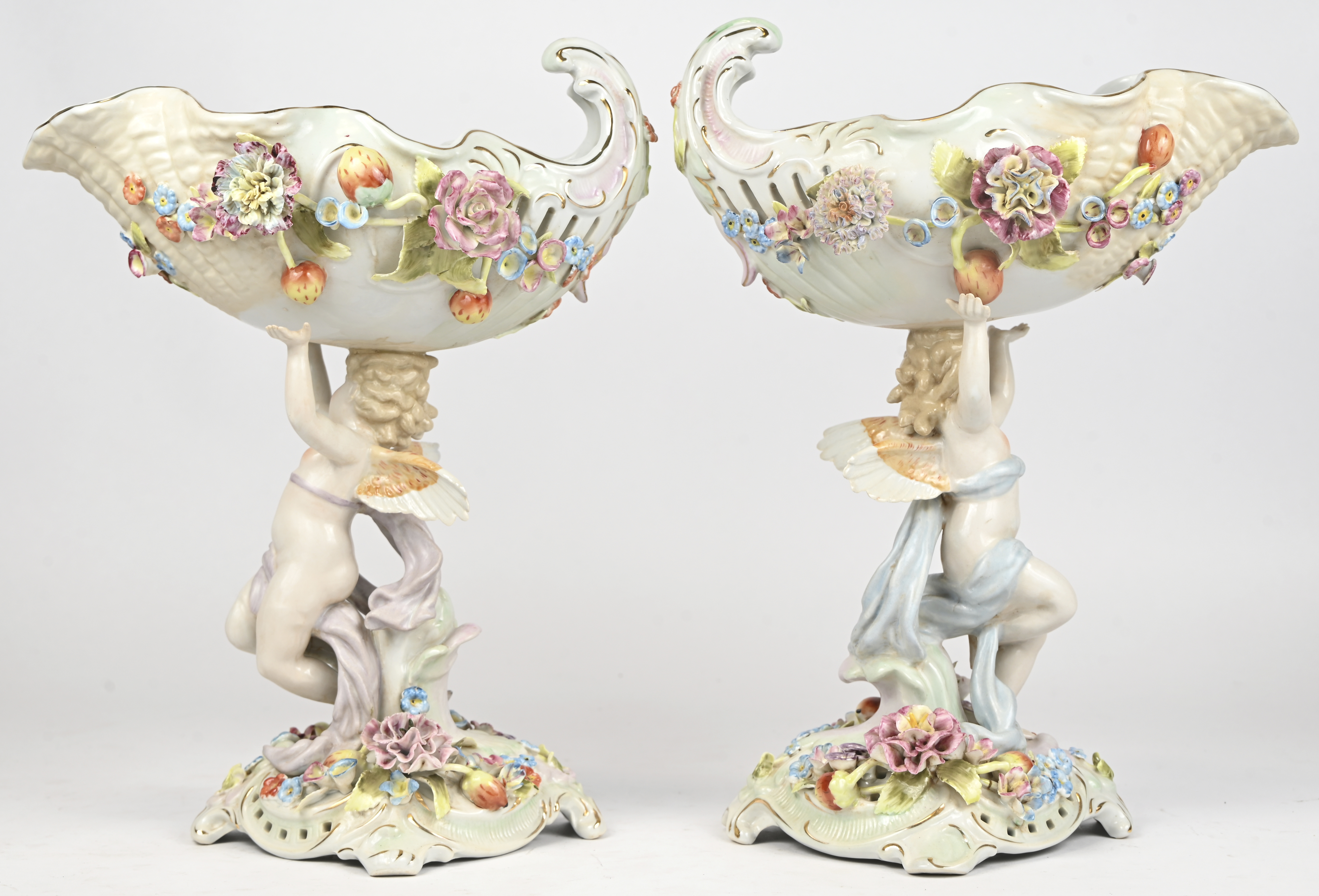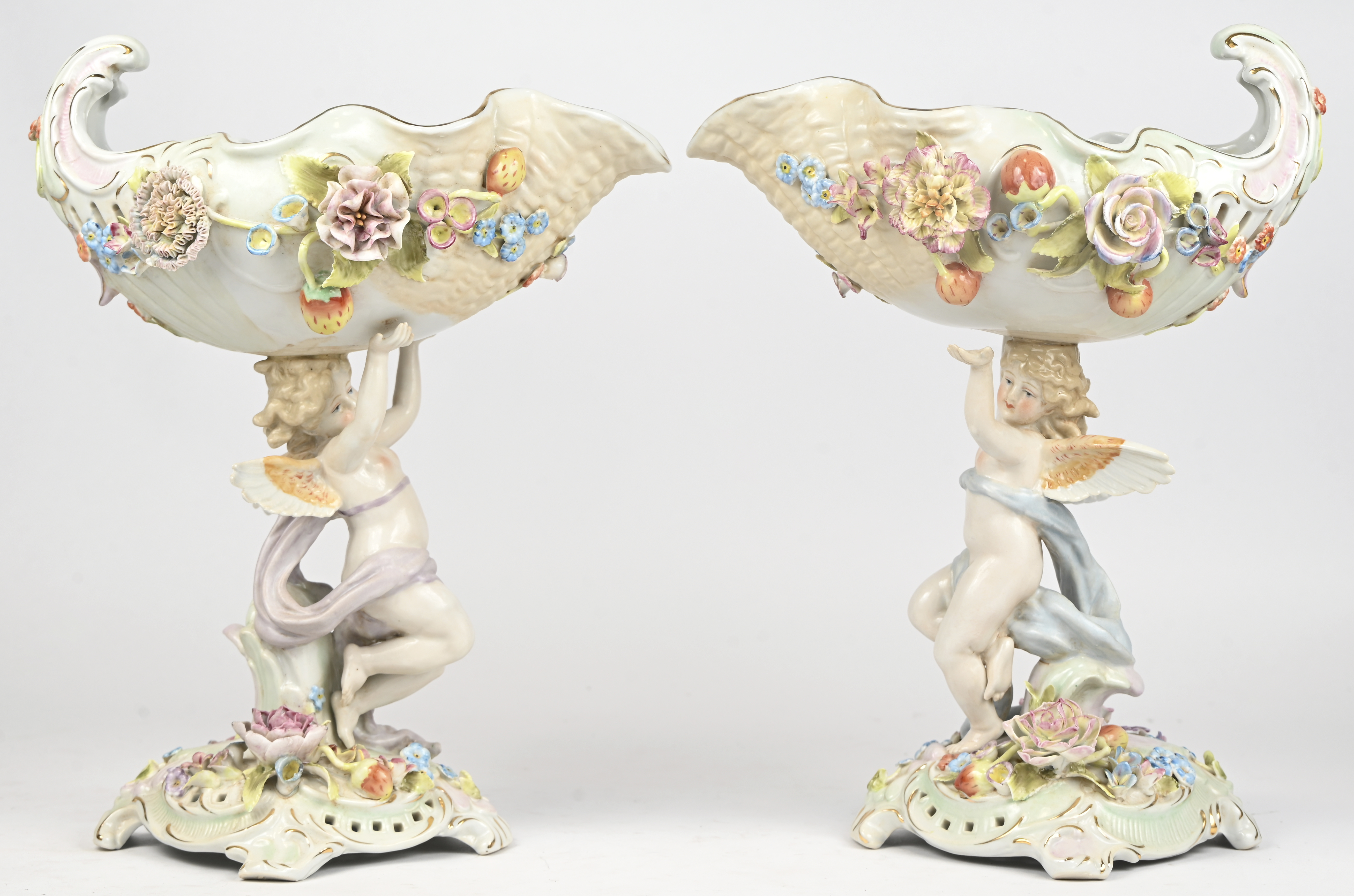Een paar schelpvormige porseleinen schalen gedragen door engelen. Gemerkt met gekruiste zwaarden boven een R.