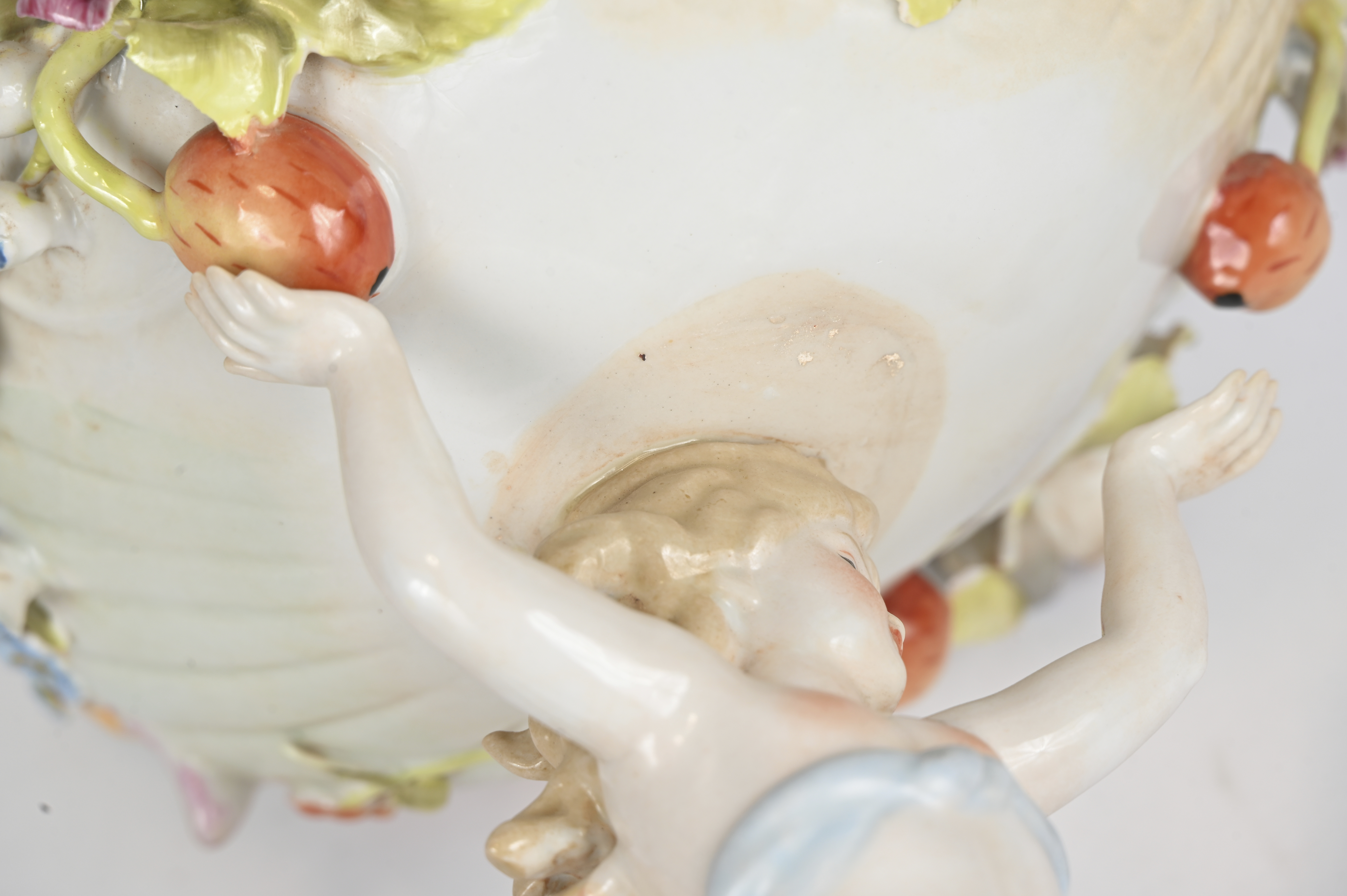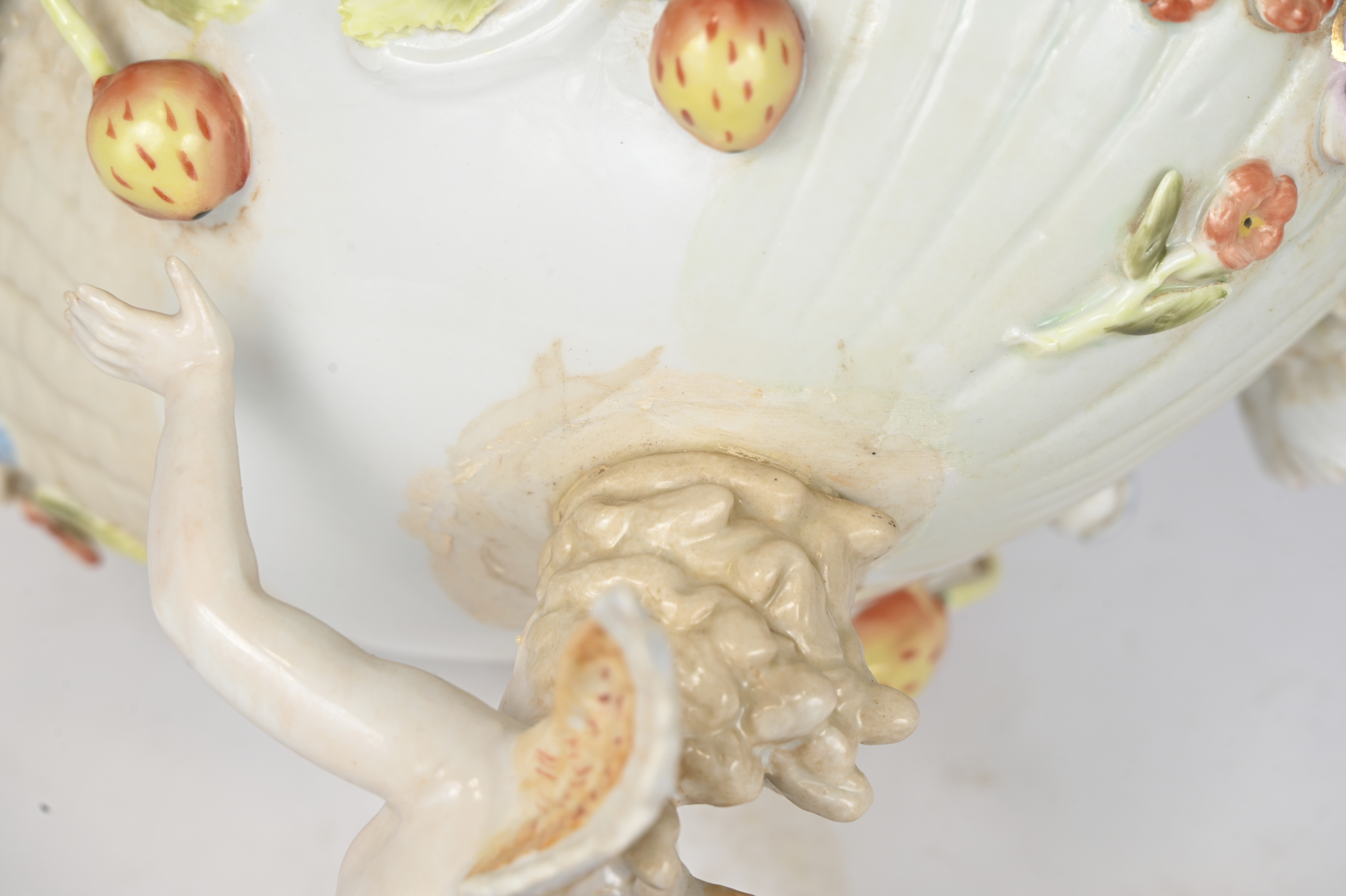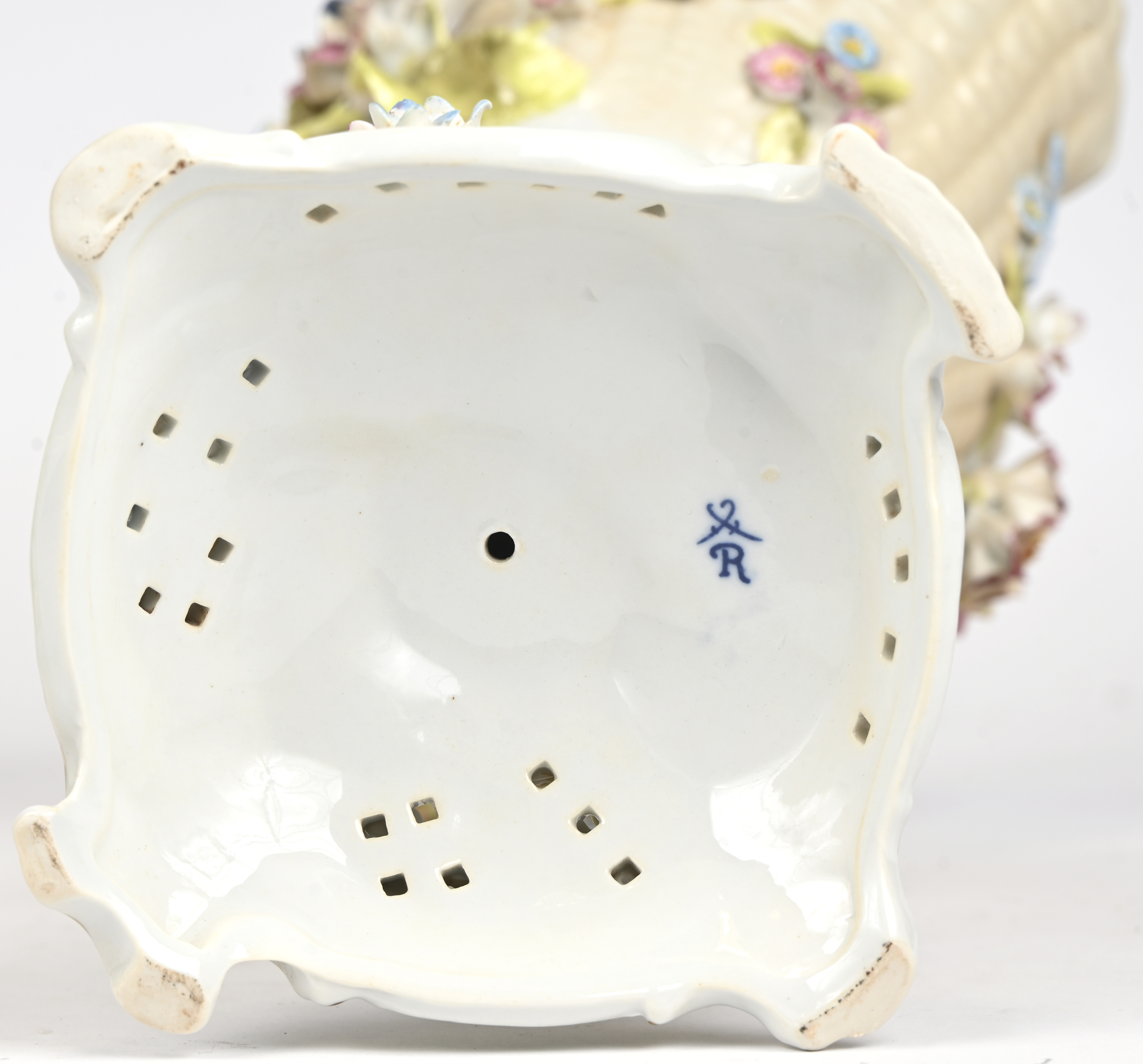 Een paar schelpvormige porseleinen schalen gedragen door engelen. Gemerkt met gekruiste zwaarden boven een R.
