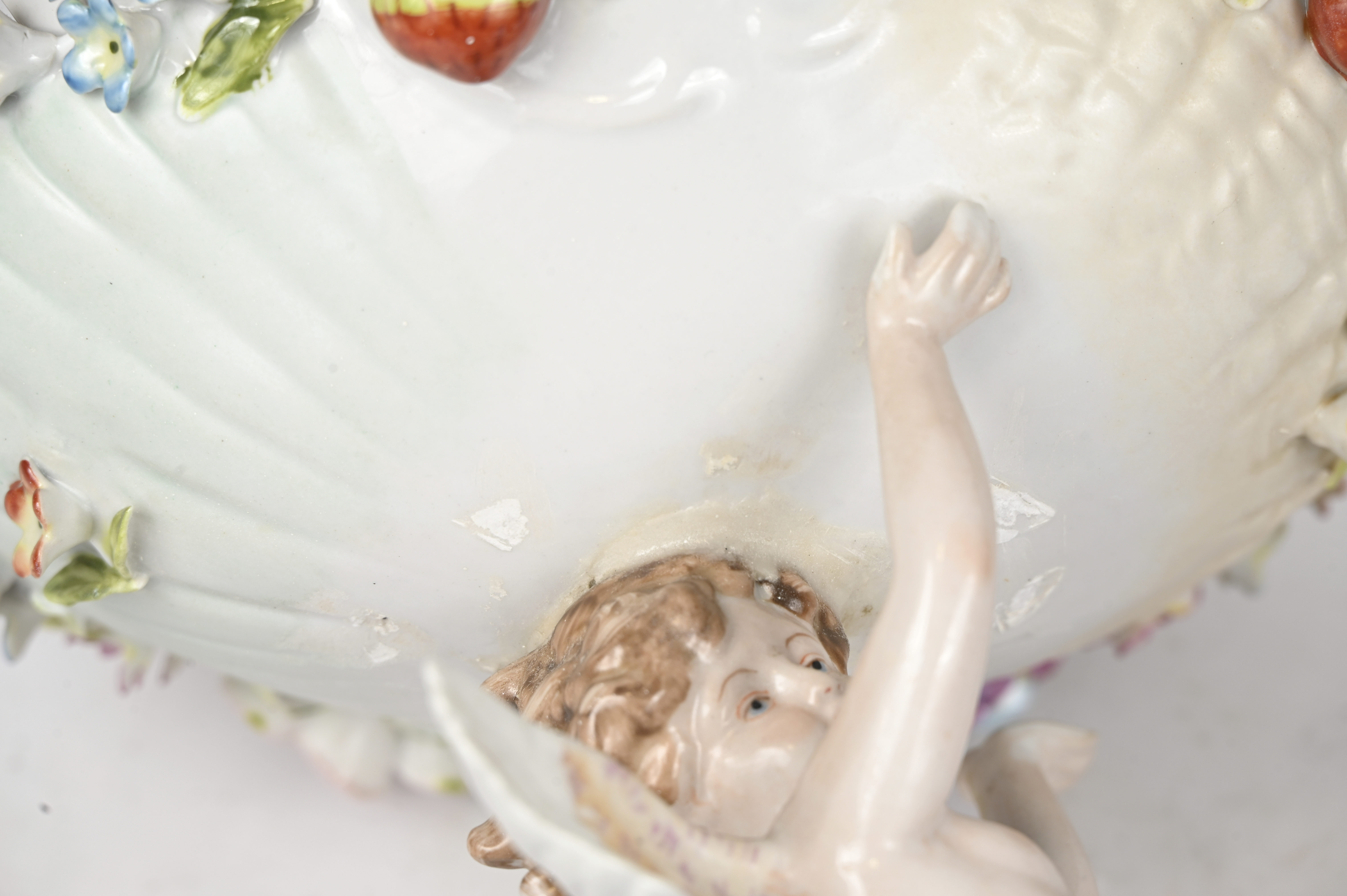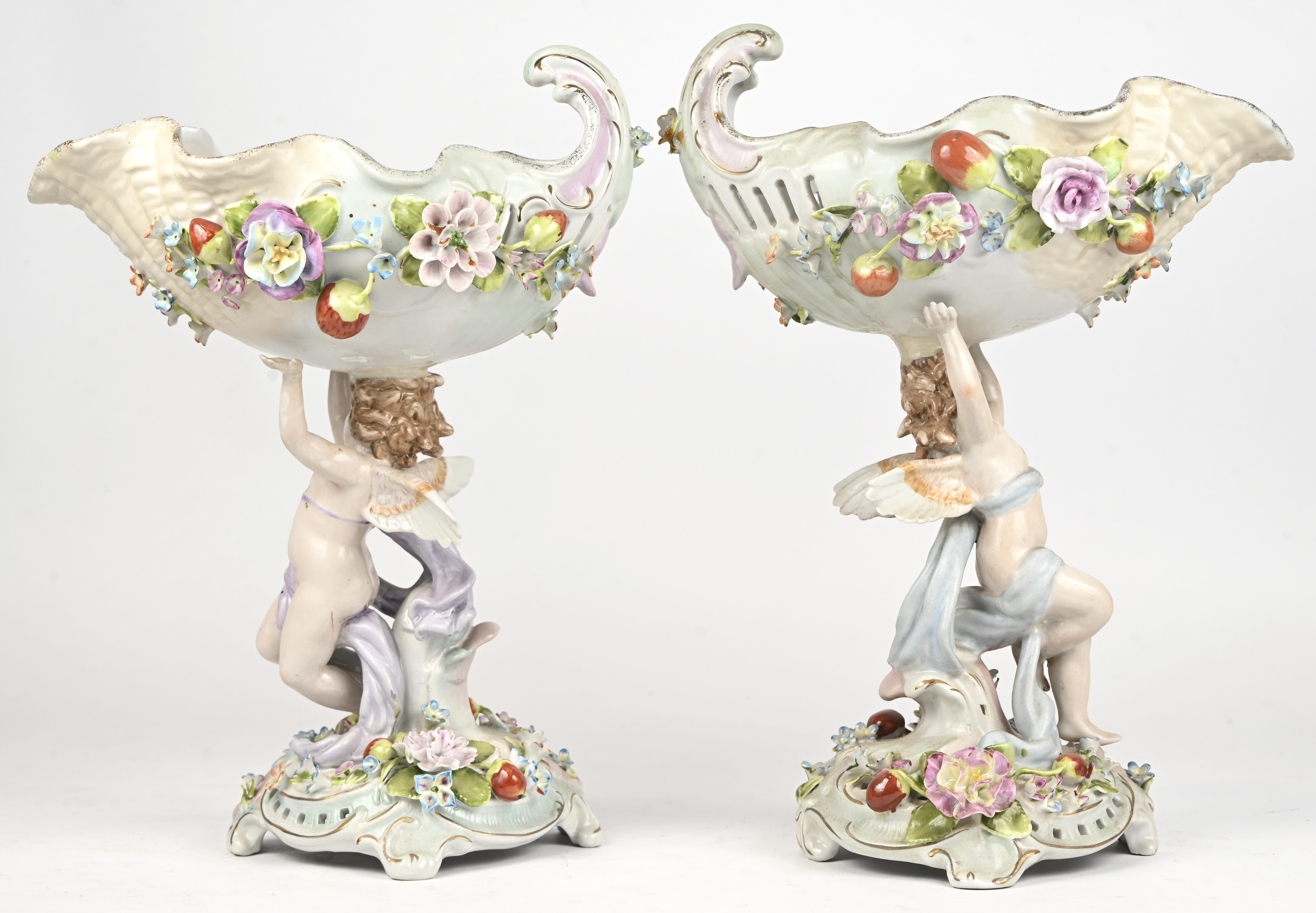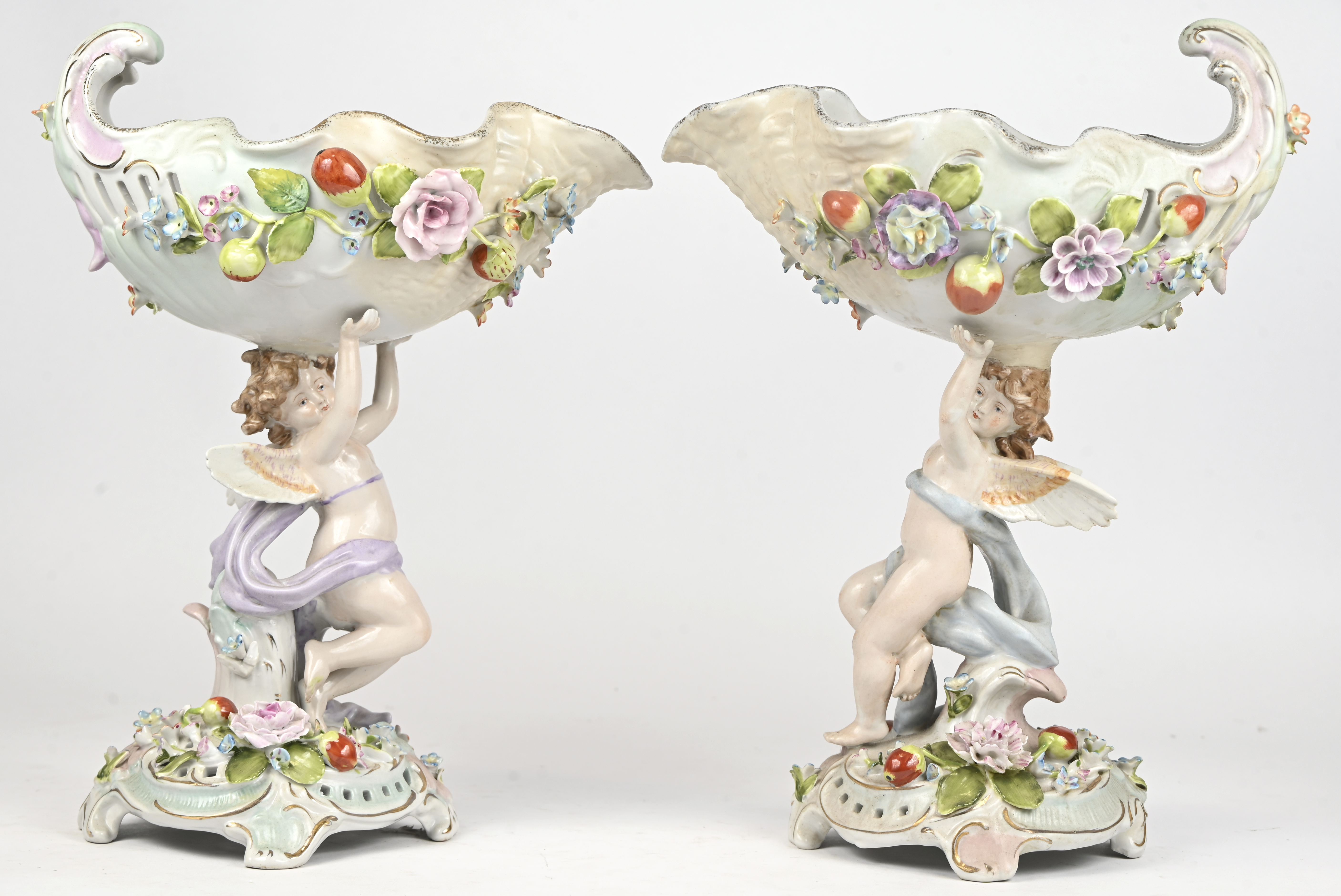 Een paar schelpvormige porseleinen schalen gedragen door engelen. Gemerkt Schierholz.