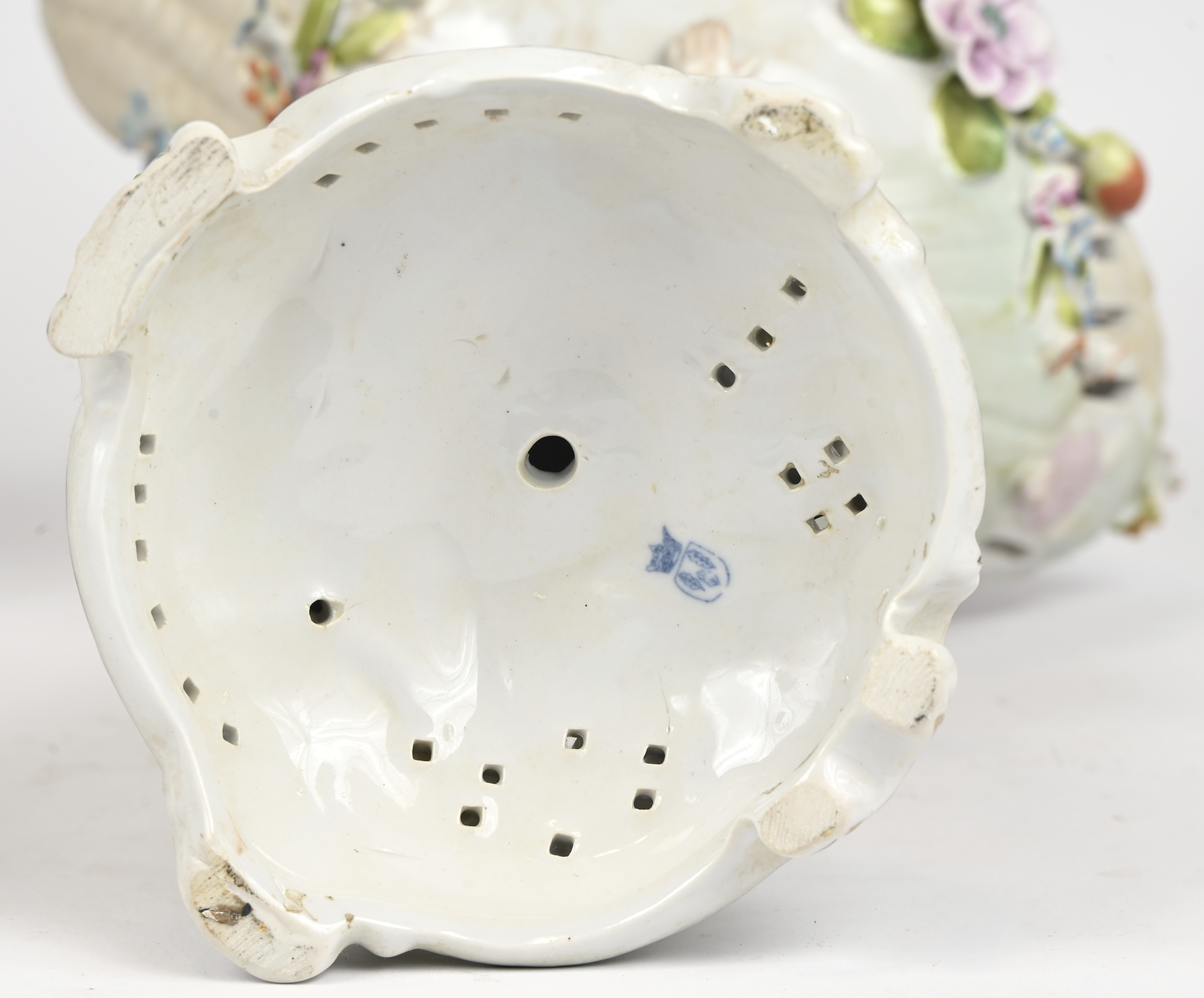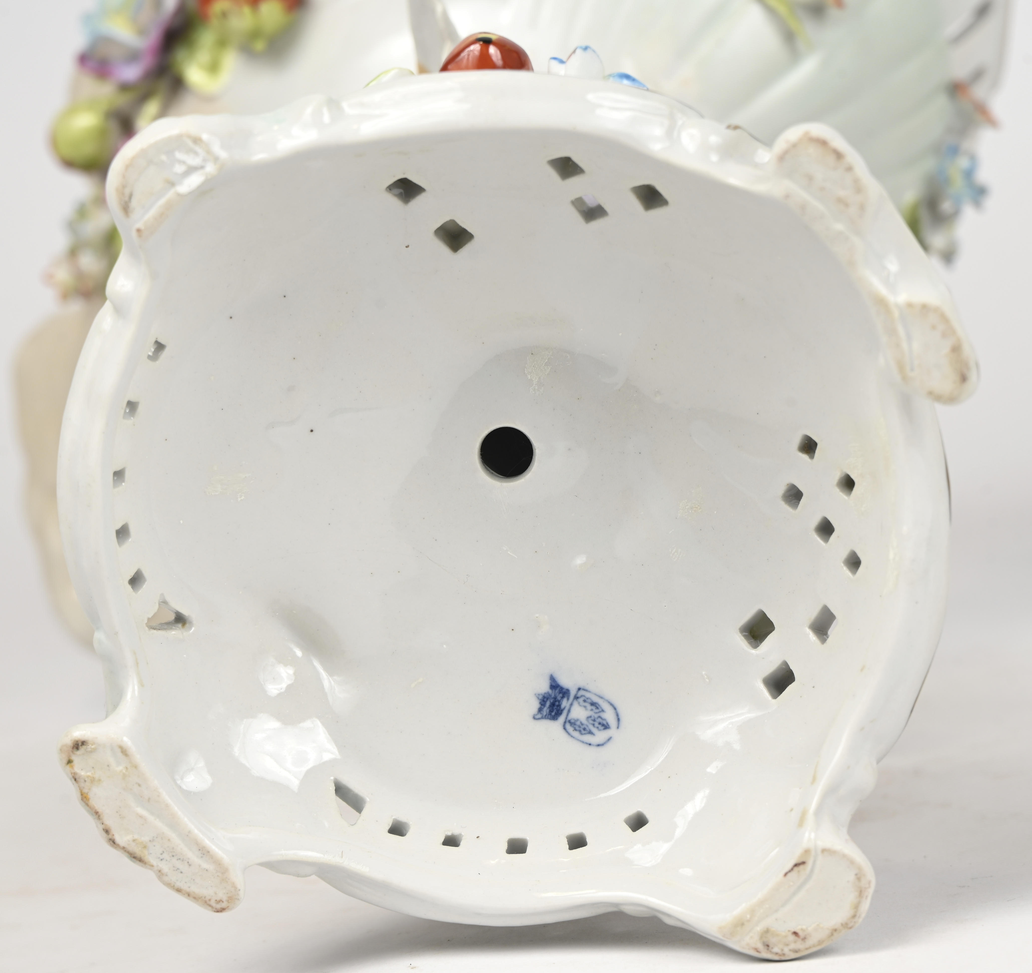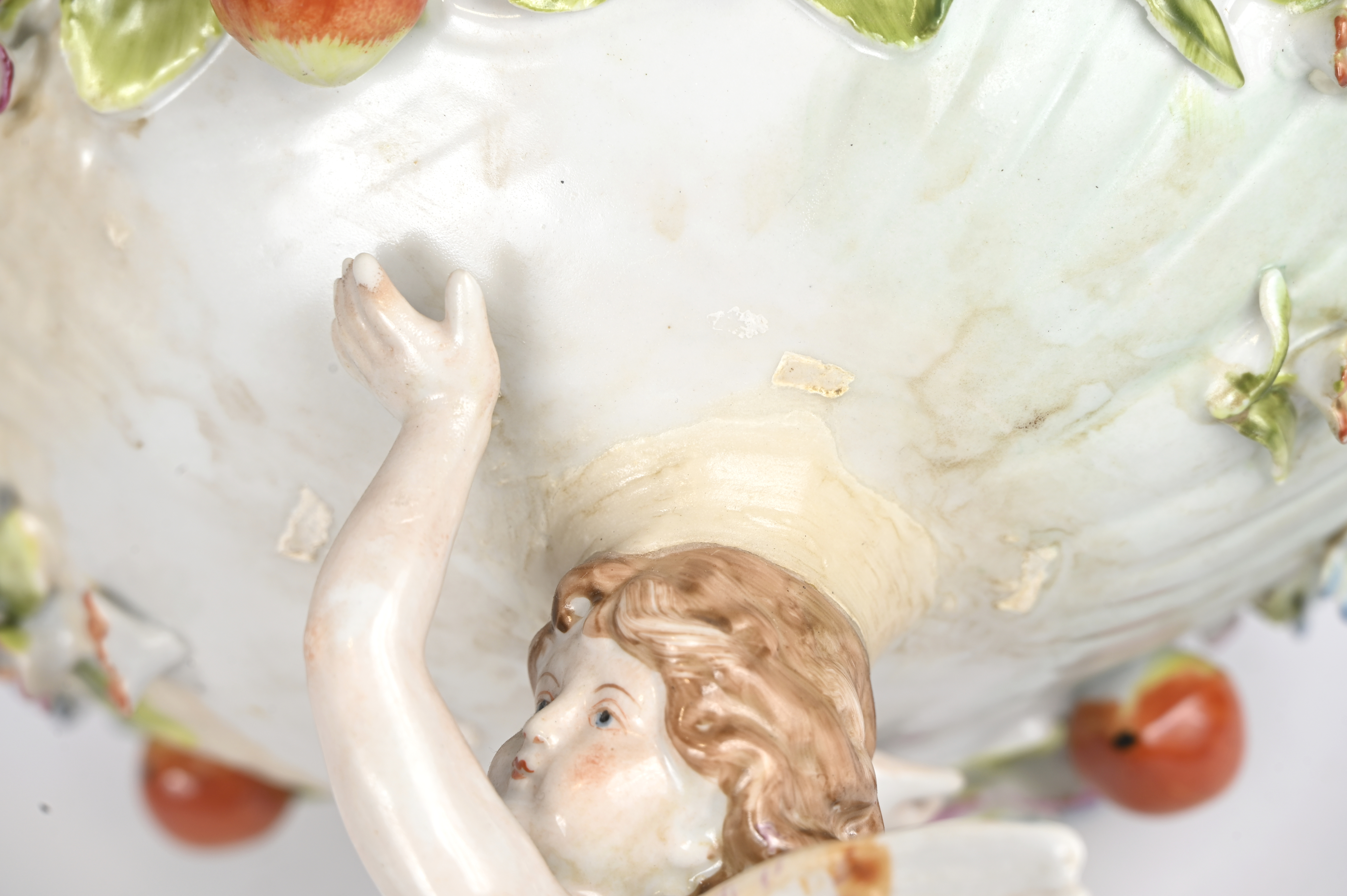 Een paar schelpvormige porseleinen schalen gedragen door engelen. Gemerkt Schierholz.