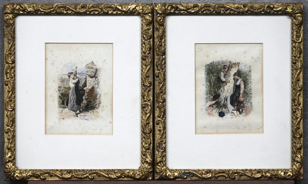 A pair of mixed media drawings, presumably from the 19th century. Monogrammed HB.