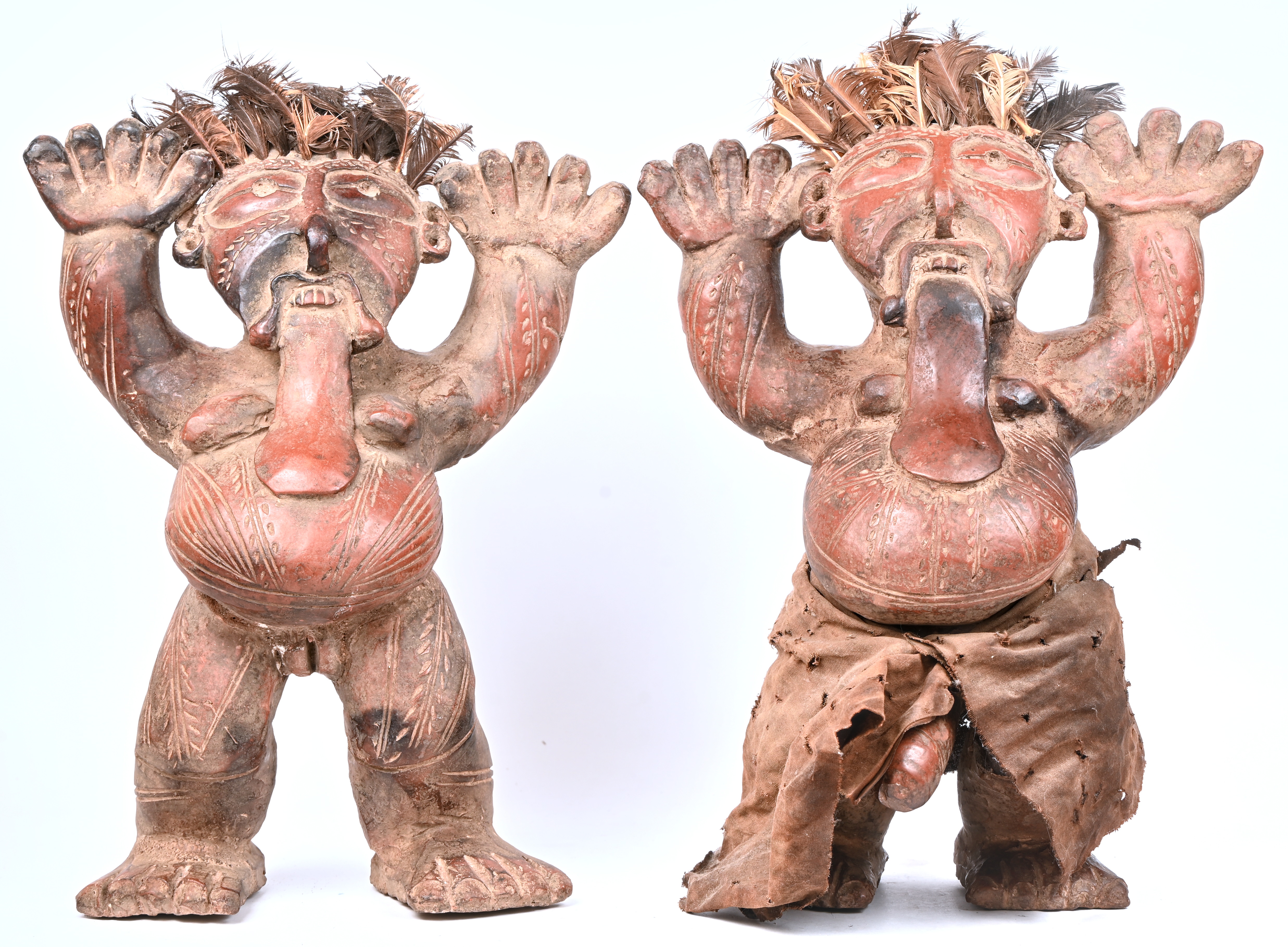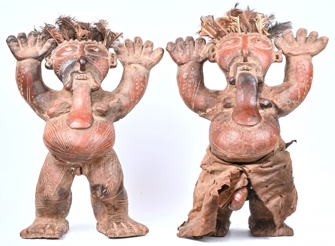 #351Een lot van 2 Nigeriaanse ceremoniele bronzen dolken, bij één ontbreekt een figuur op het handvat.