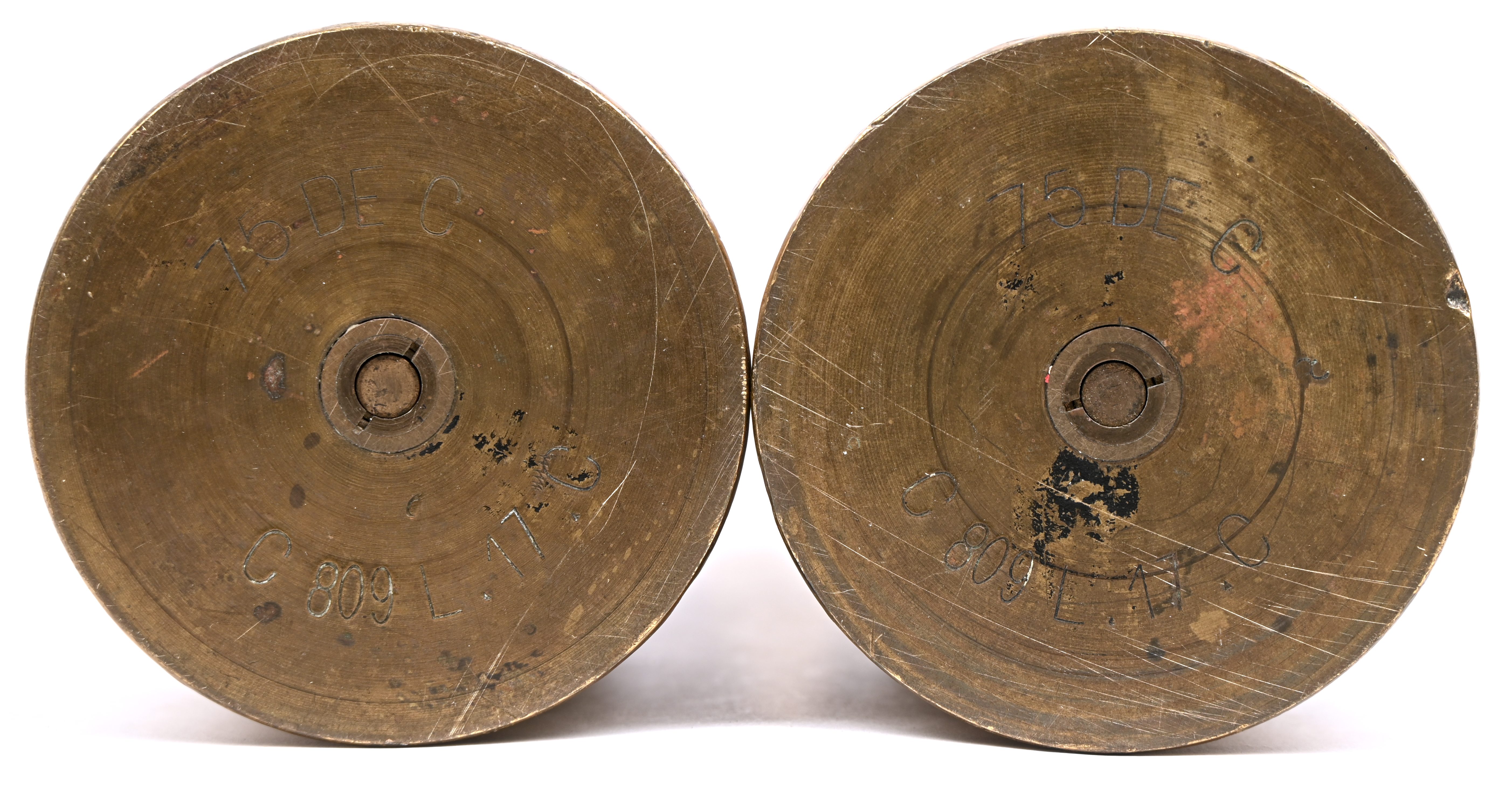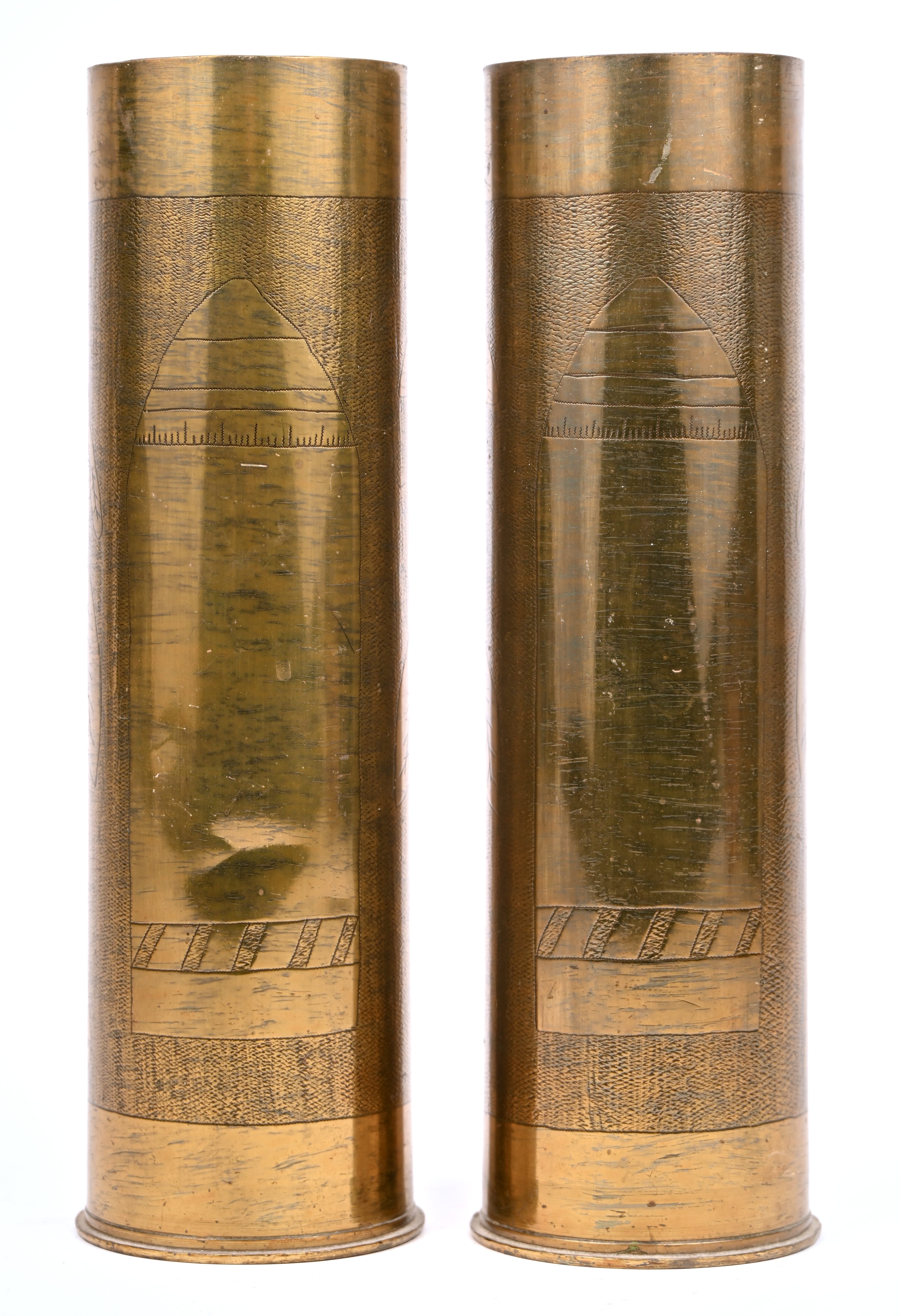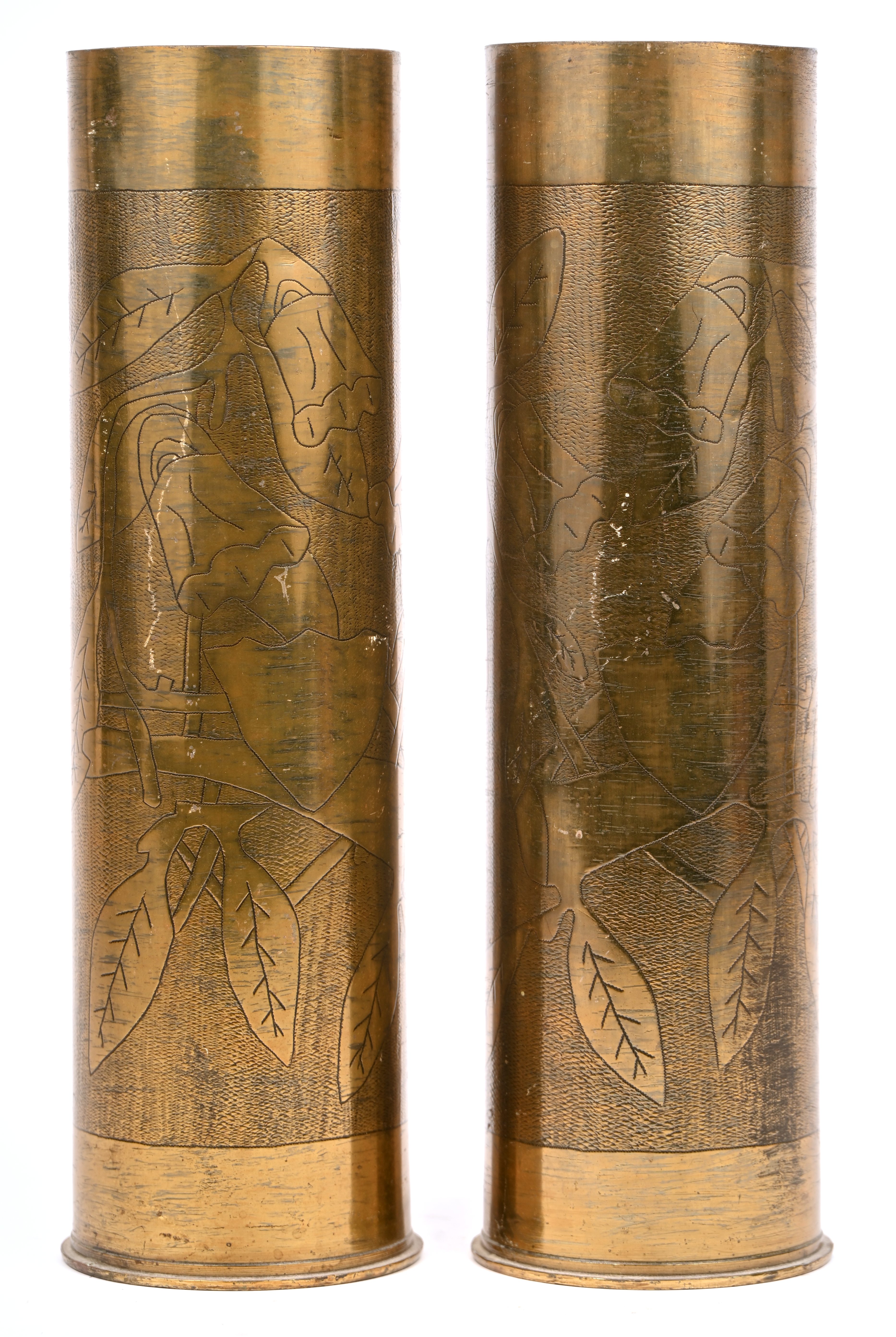 Een paar trench-art vazen met een floraal decor.