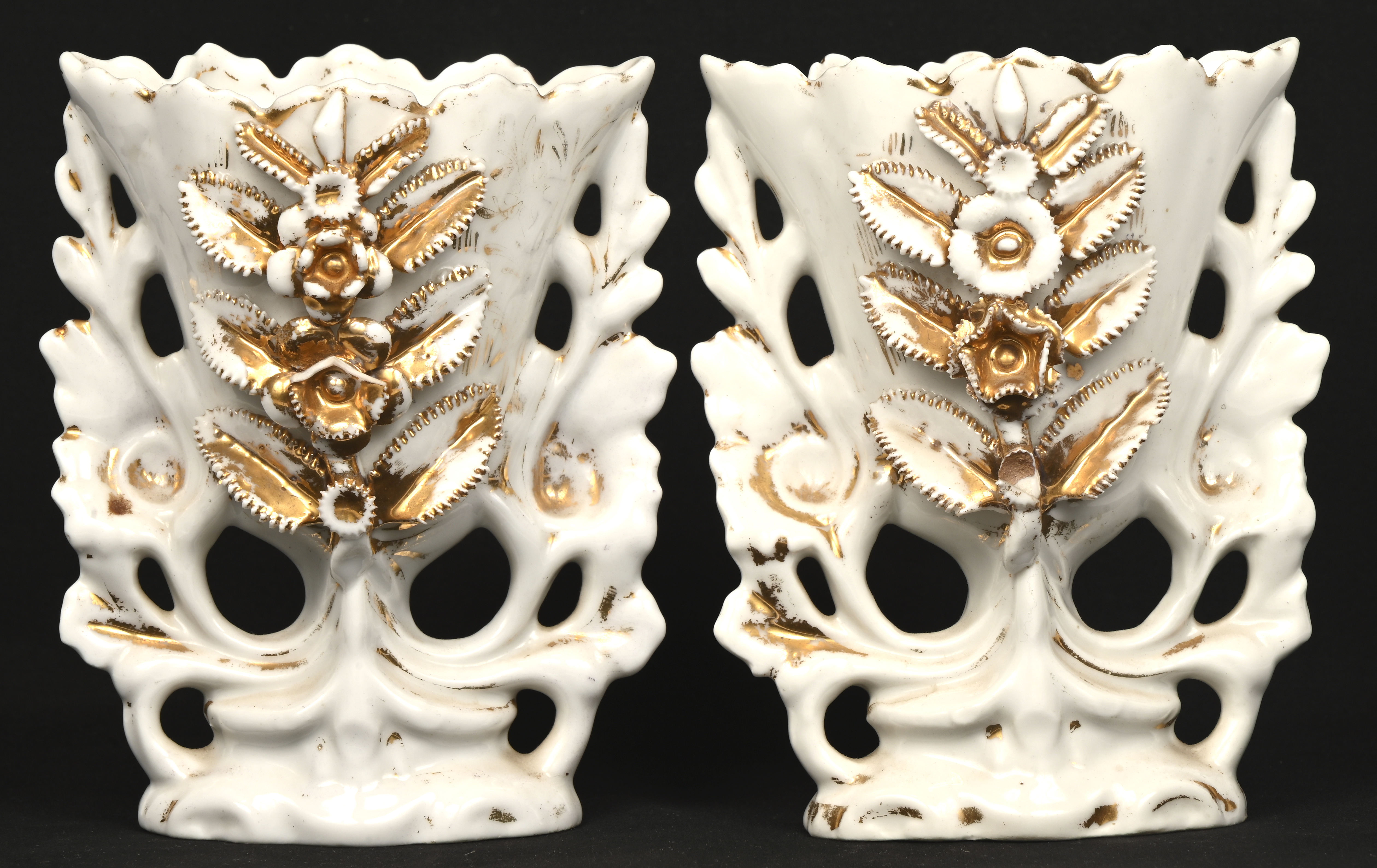 A pair of Old Brussels vases, damaged.