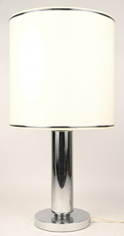 #200Een vintage tafellamp met verchroomd metalen voet en ecru lampenkap. Niet gemerkt.