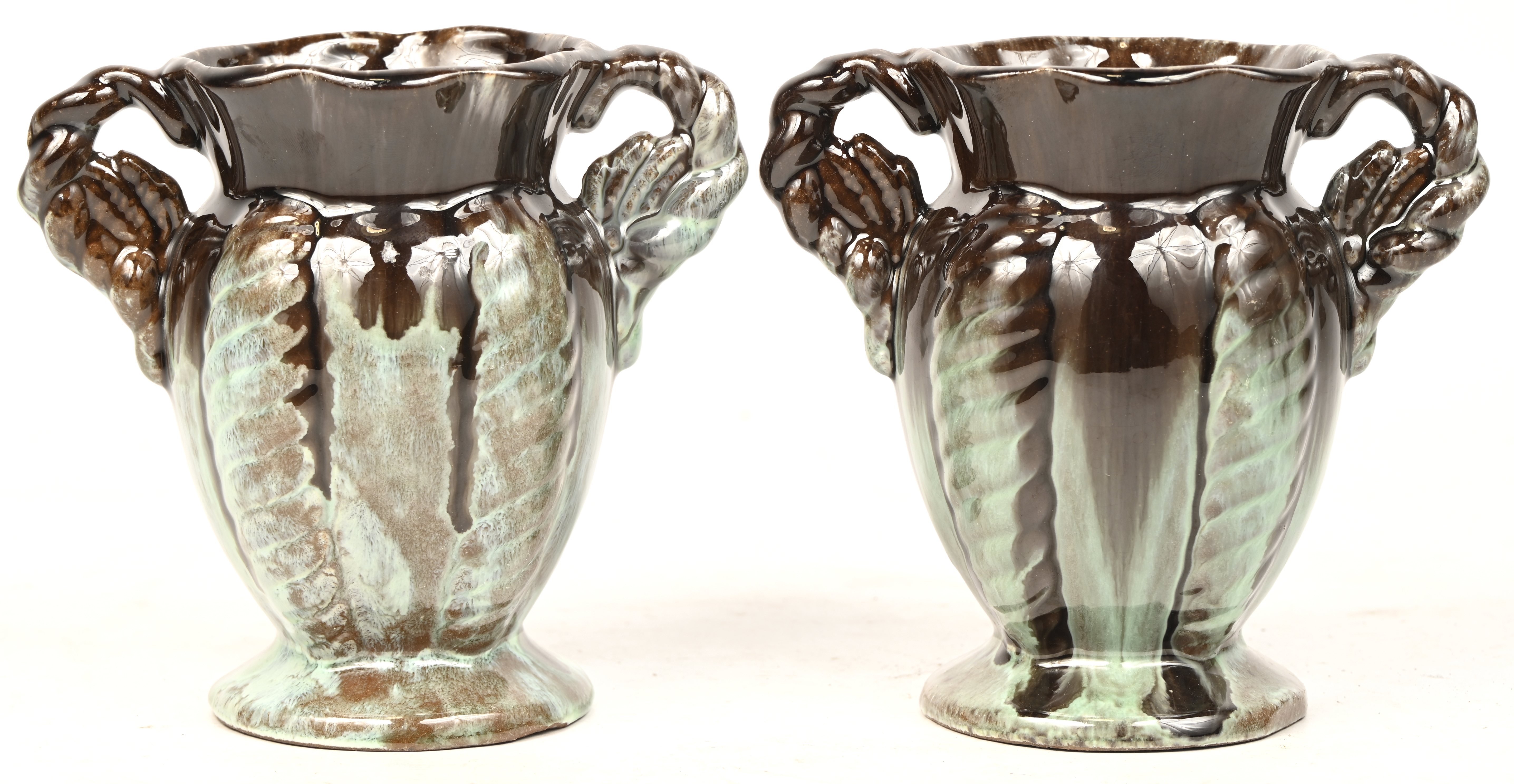 Two vases and one pitcher of Flemish earthenware. Added a German stoneware vase with leaf motifs. -
