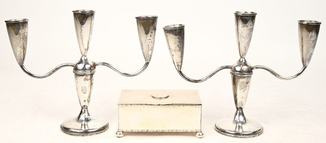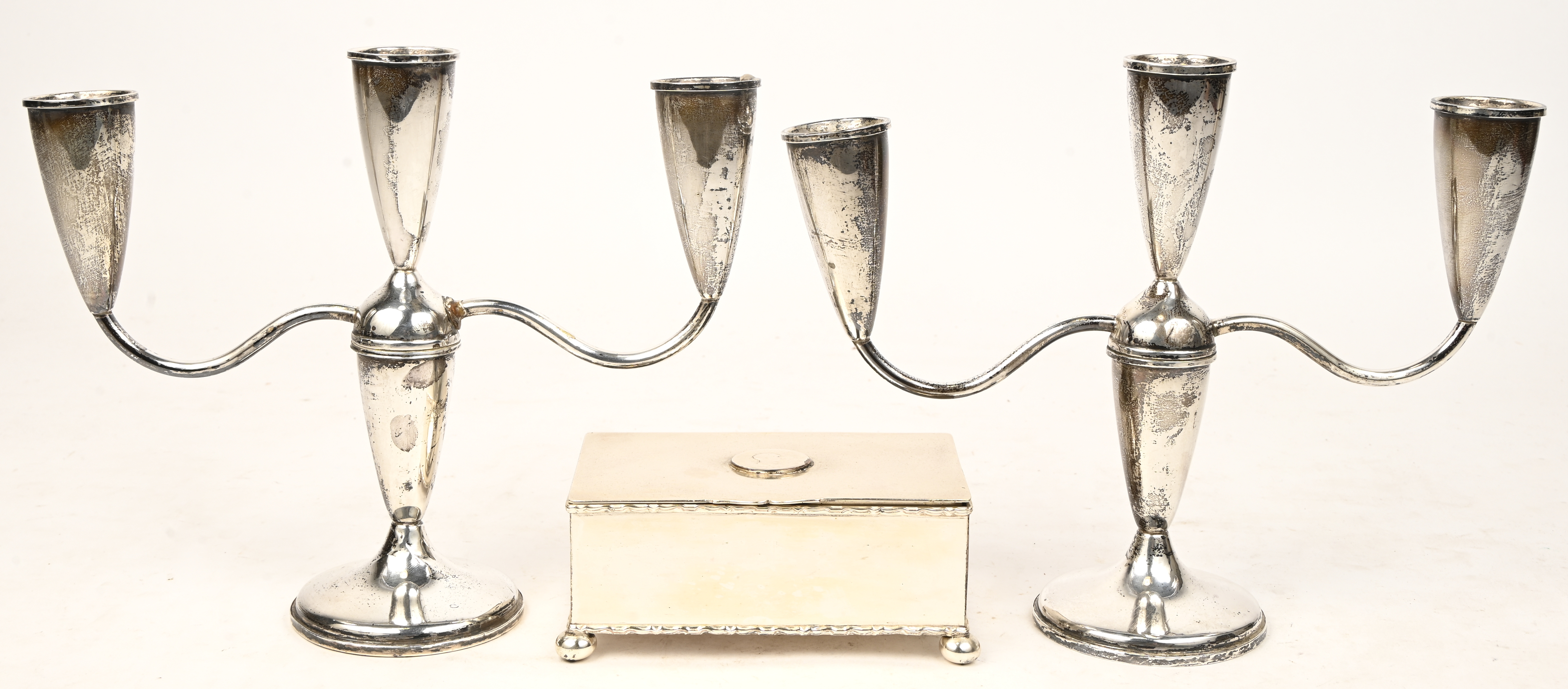#11Een paar verzilverde kandelaars met drie armen, Engelse stijl.