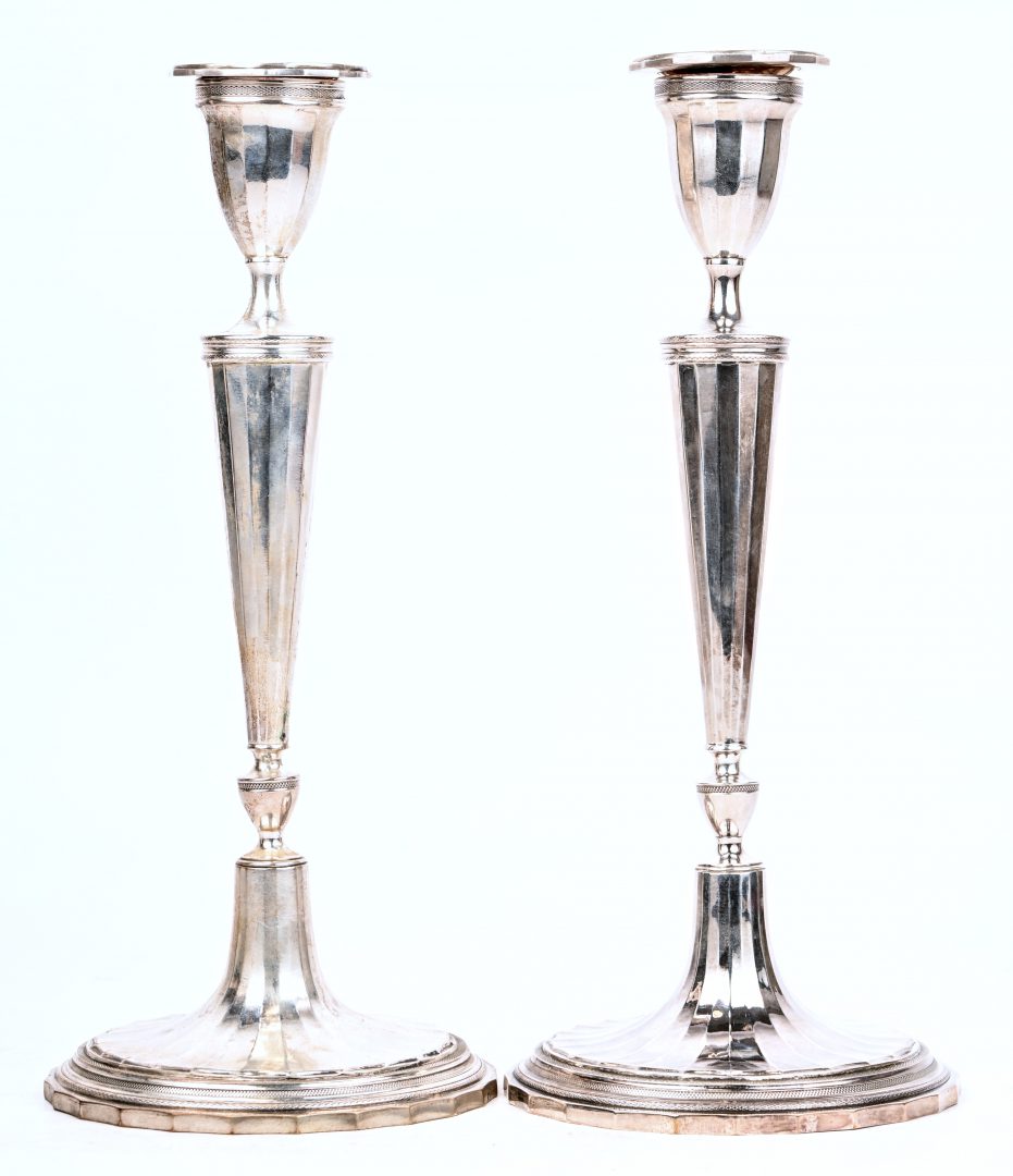 Een paar zilveren kandelaars in Georgian stijl met losse wasvangen.