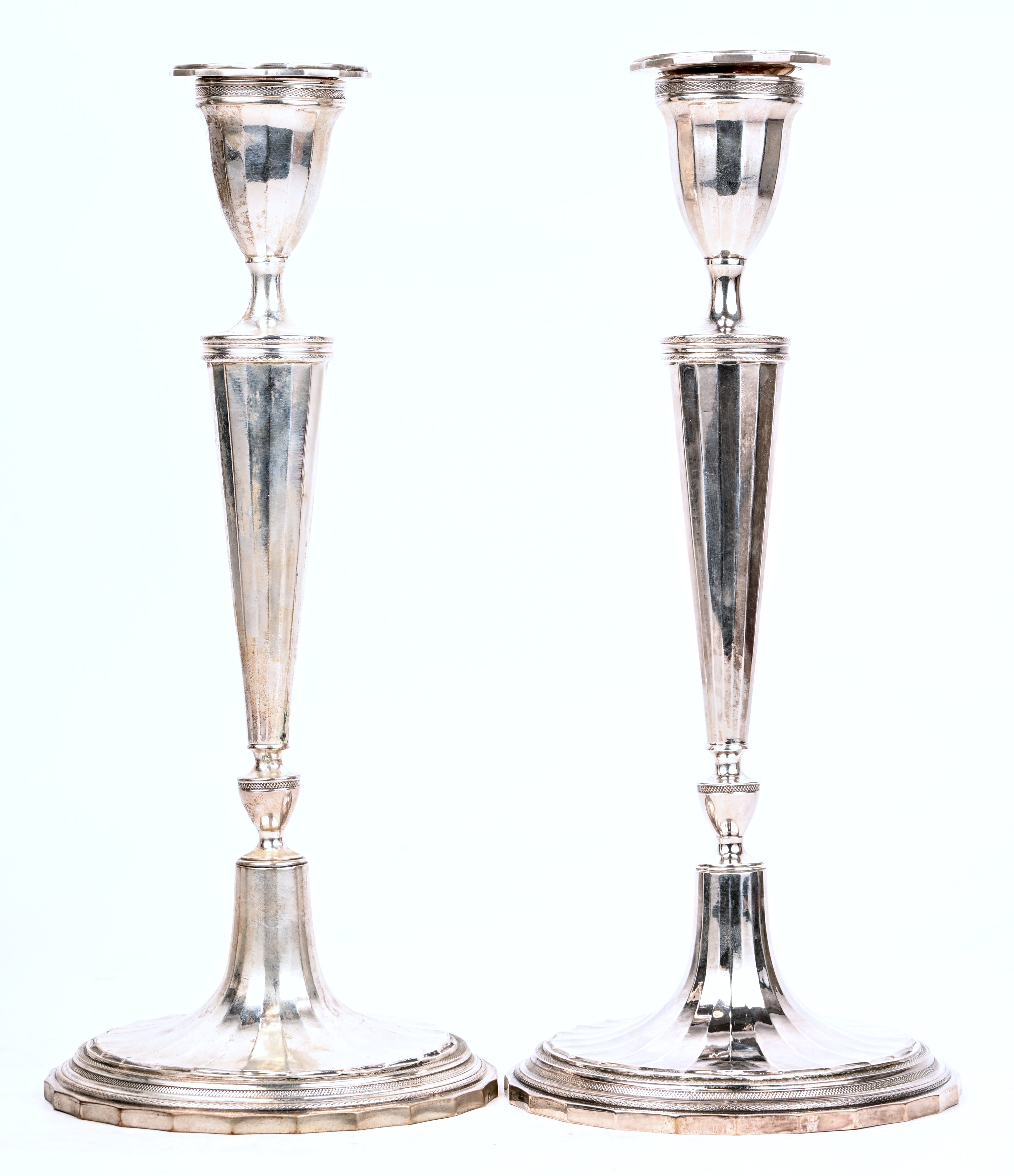 A pair of silver candlesticks in Georgian style with detachable wax catchers.