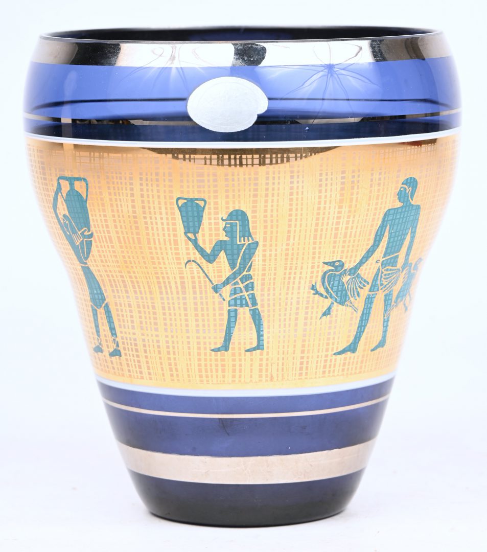 A purple vase made of Booms glass, with Egyptian figures in a golden frieze.