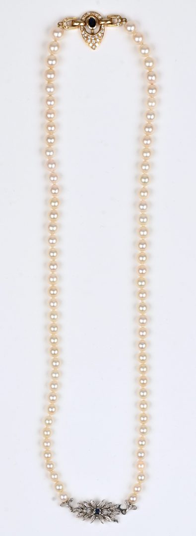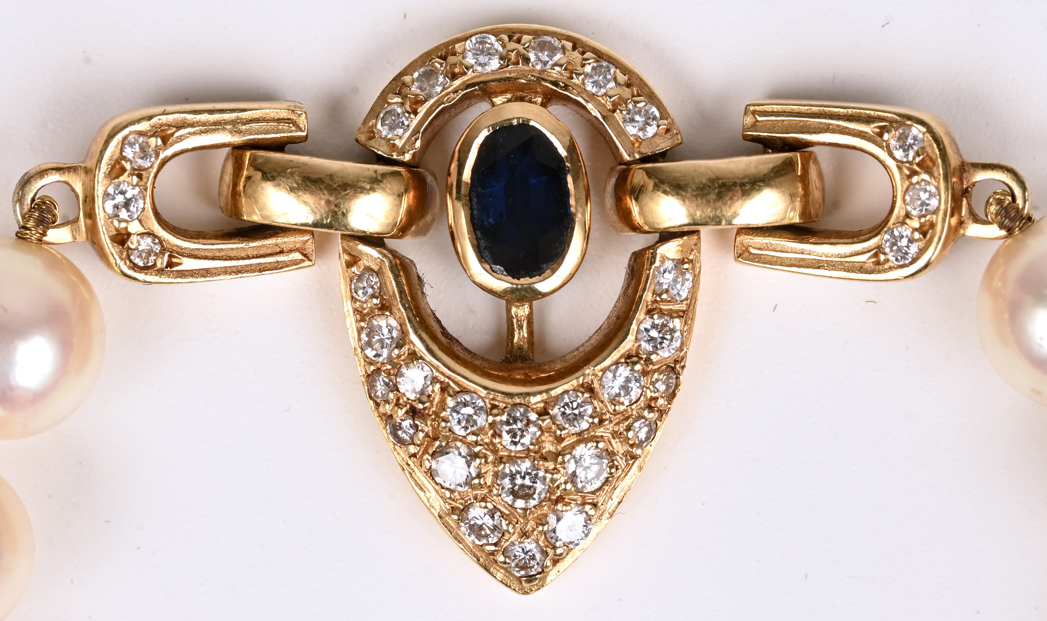 A pearl necklace with an 18 kt yellow gold pendant set with diamonds totaling approximately 0.30 ct and a sapphire of approximately 0.30 ct. It also has an 18 kt white gold clasp set with a sapphire of approximately 0.10 ct.