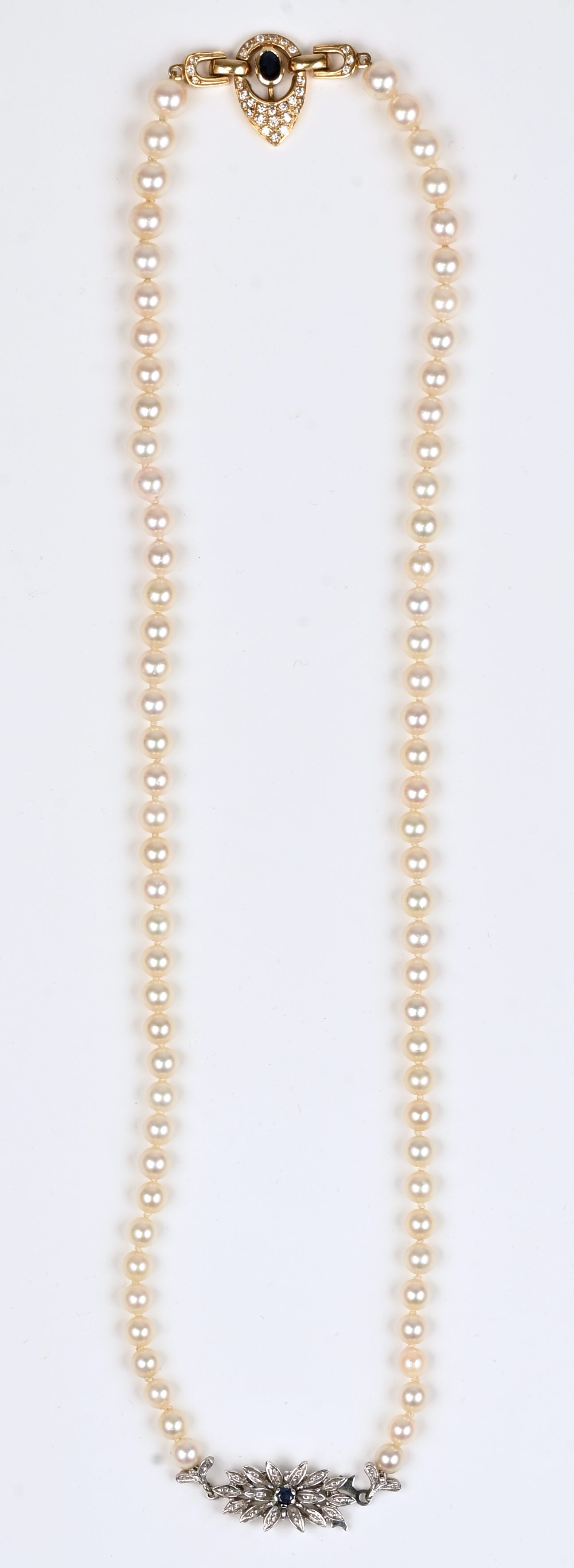 Een parelhalssnoer met 18 kt geelgouden hanger bezet briljanten met een gezamenlijk gewicht van +- 0,30 ct en een saffier van +- 0,30 ct. en een 18 kt witgouden slot bezet met een saffier van +- 0,10 ct.