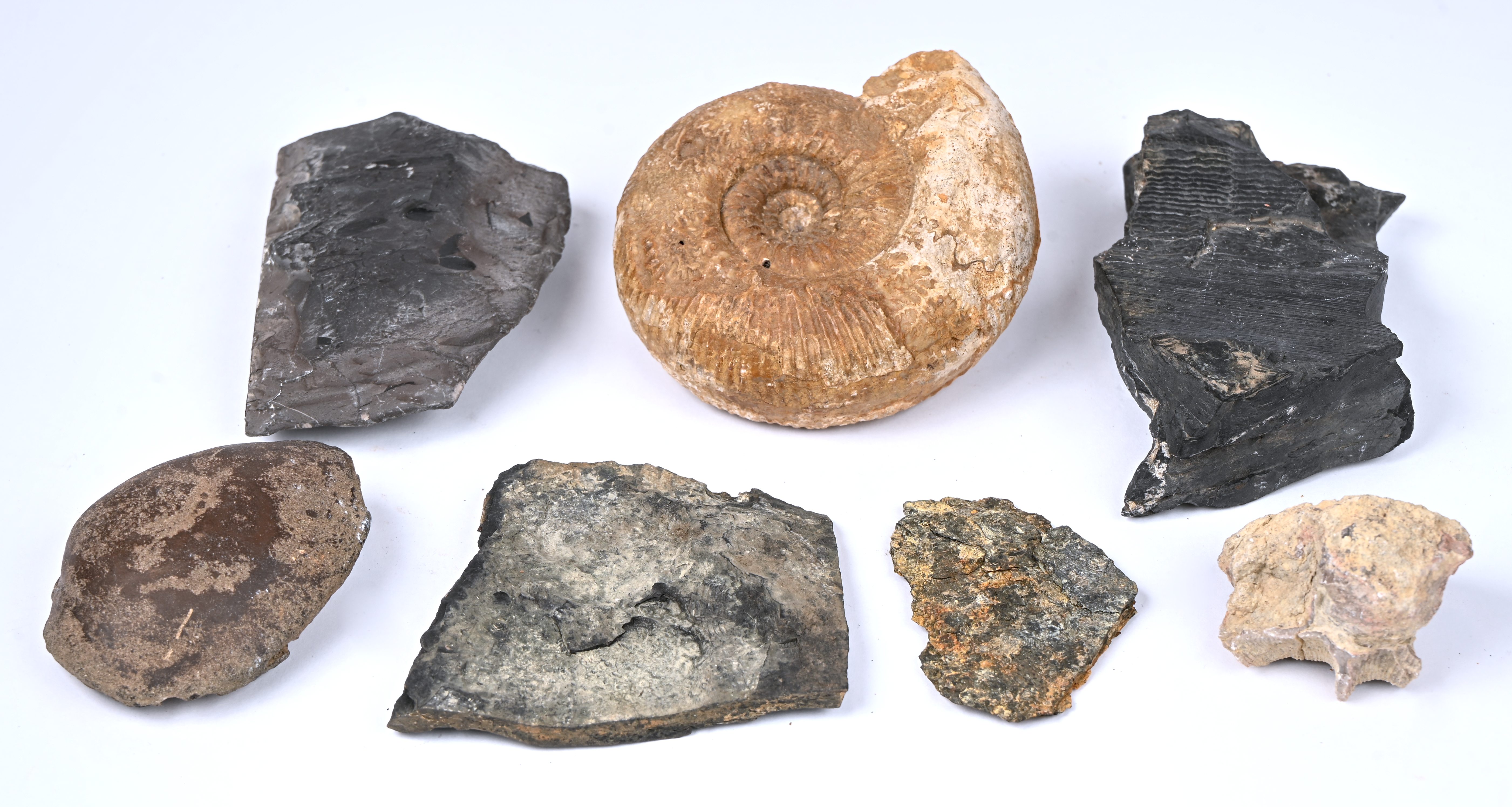 Een partij fossielen bestaande uit een amoniet, varens, koraal een schelp en trilobieten.