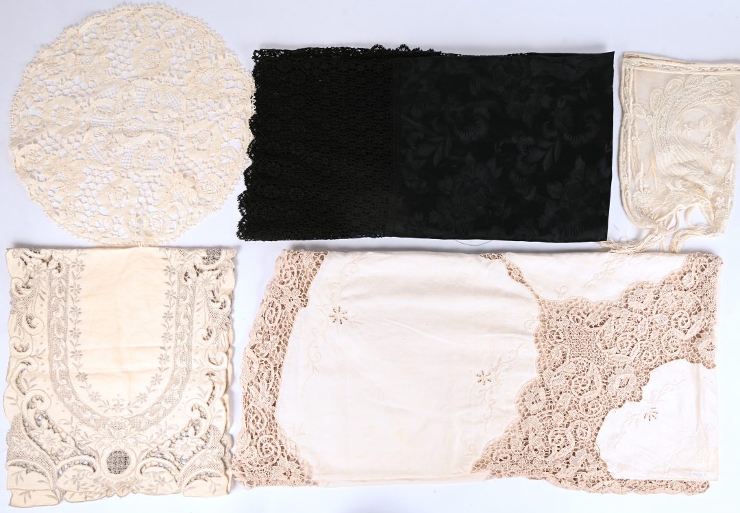 A batch of lace and embroidery work. Consisting of a tablecloth, a scarf, and several other pieces.