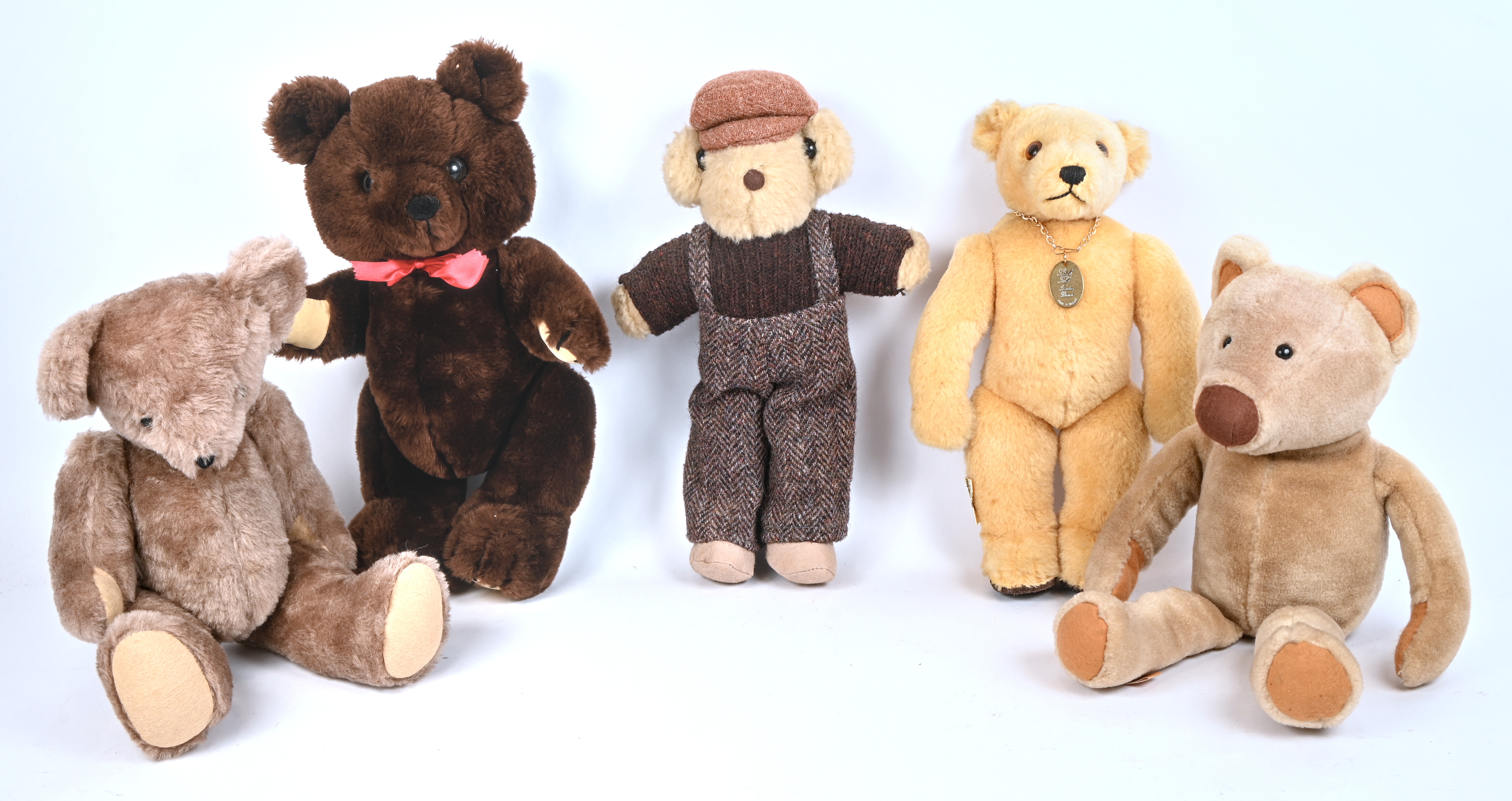 #64Zes middelgrote knuffelberen van verschillende merken. ‘Glant Pacific’, ‘Deans Childsplay Toys’, ‘Sterling Bear 1088/10.000’, ‘Baby Watson’, één merkloos en één onleesbaar getekend en genummerd 265-1500.