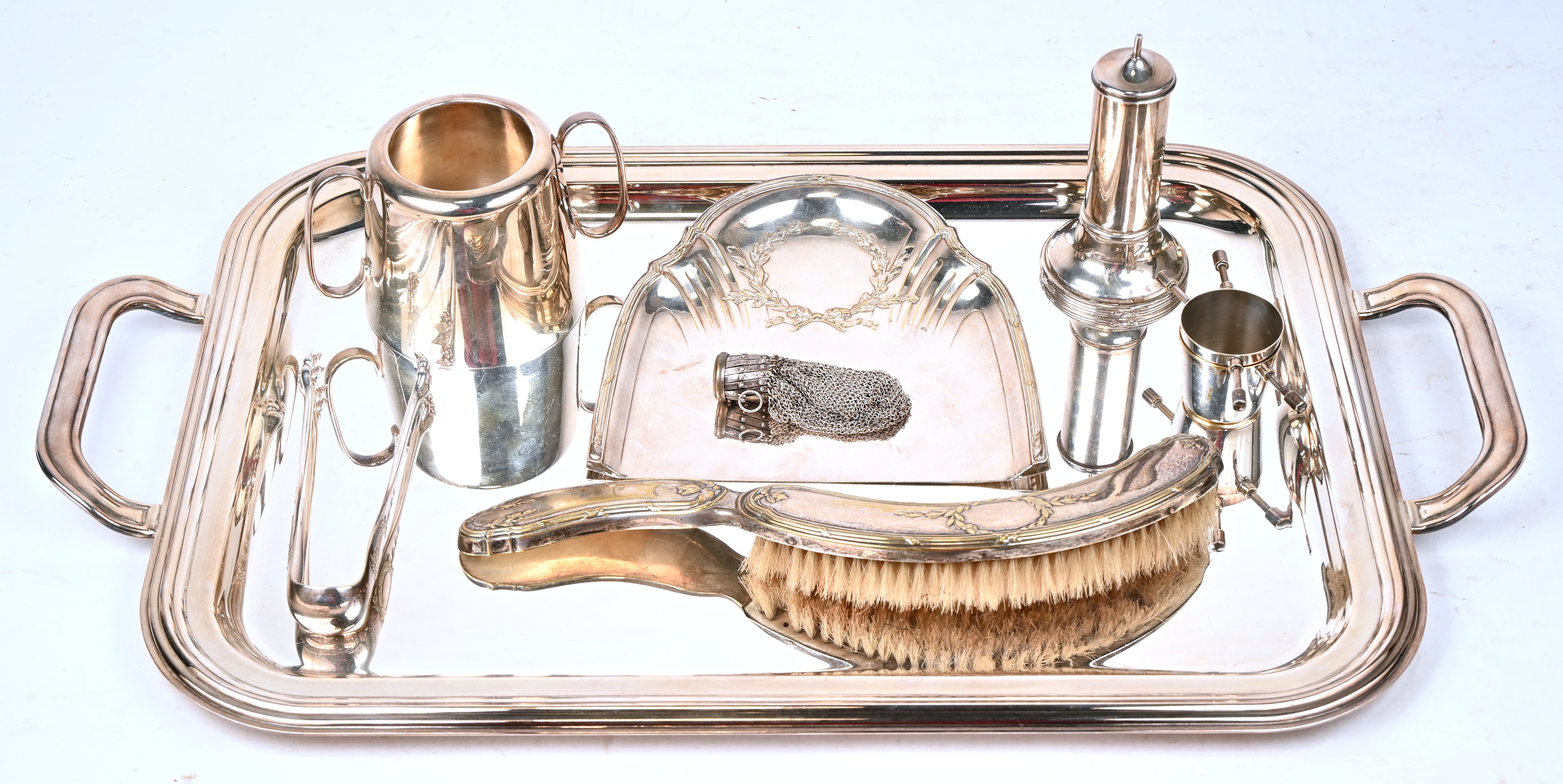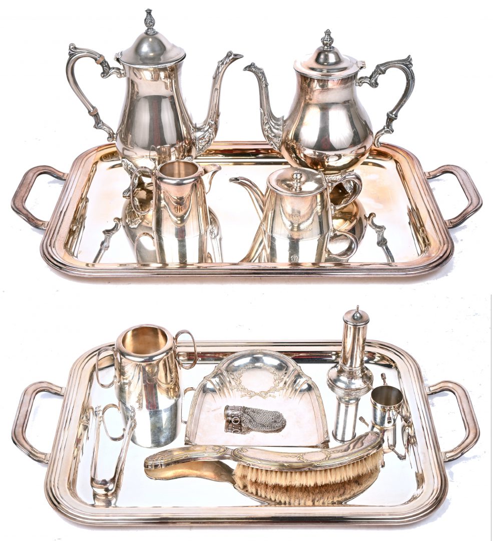 Een partij verzilverd bestaande uit twee dienbladen, twee koffiepotten, een tandenstokerkoker, etc.