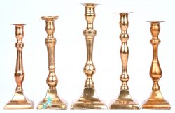 #472Vijf messingen kandelaars van verschillende grote. Eind 19de eeuw.