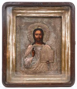 #225Christus Pantocrator. Een 19e eeuws Russische icoon met koperen riza in een vitrinekistje.