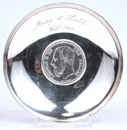 A silver dish with inscription: Mary et Lolite Noël 1969, marked A925, featuring a central silver coin: Leopold II Roi Des Belges, 1869. AR47. -