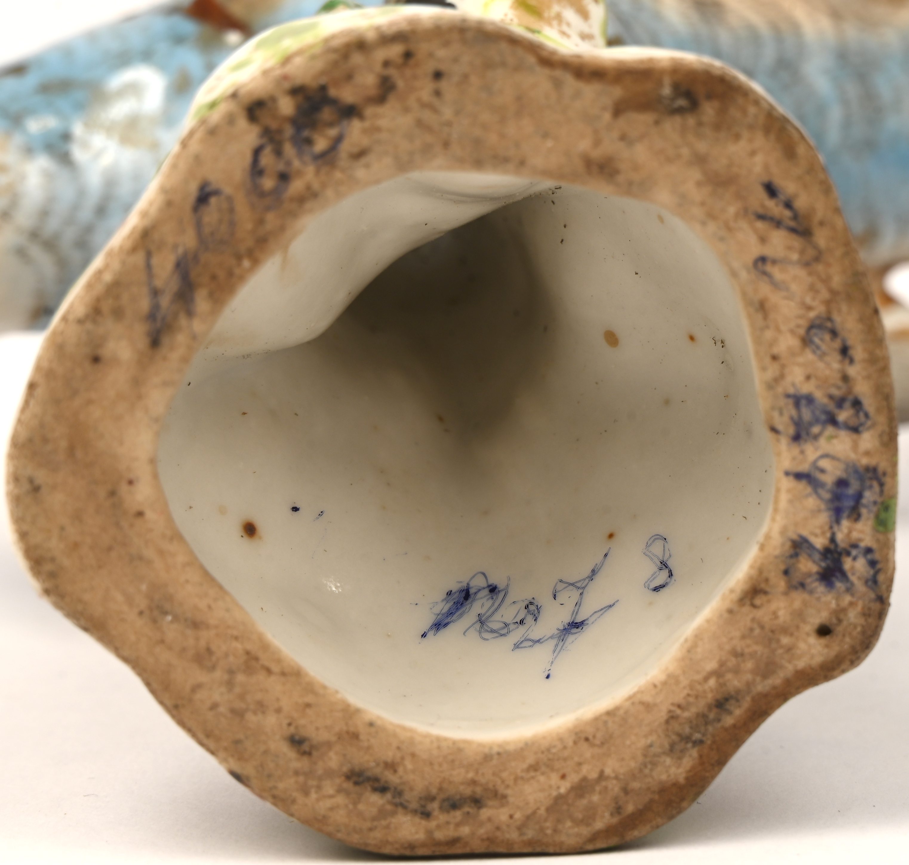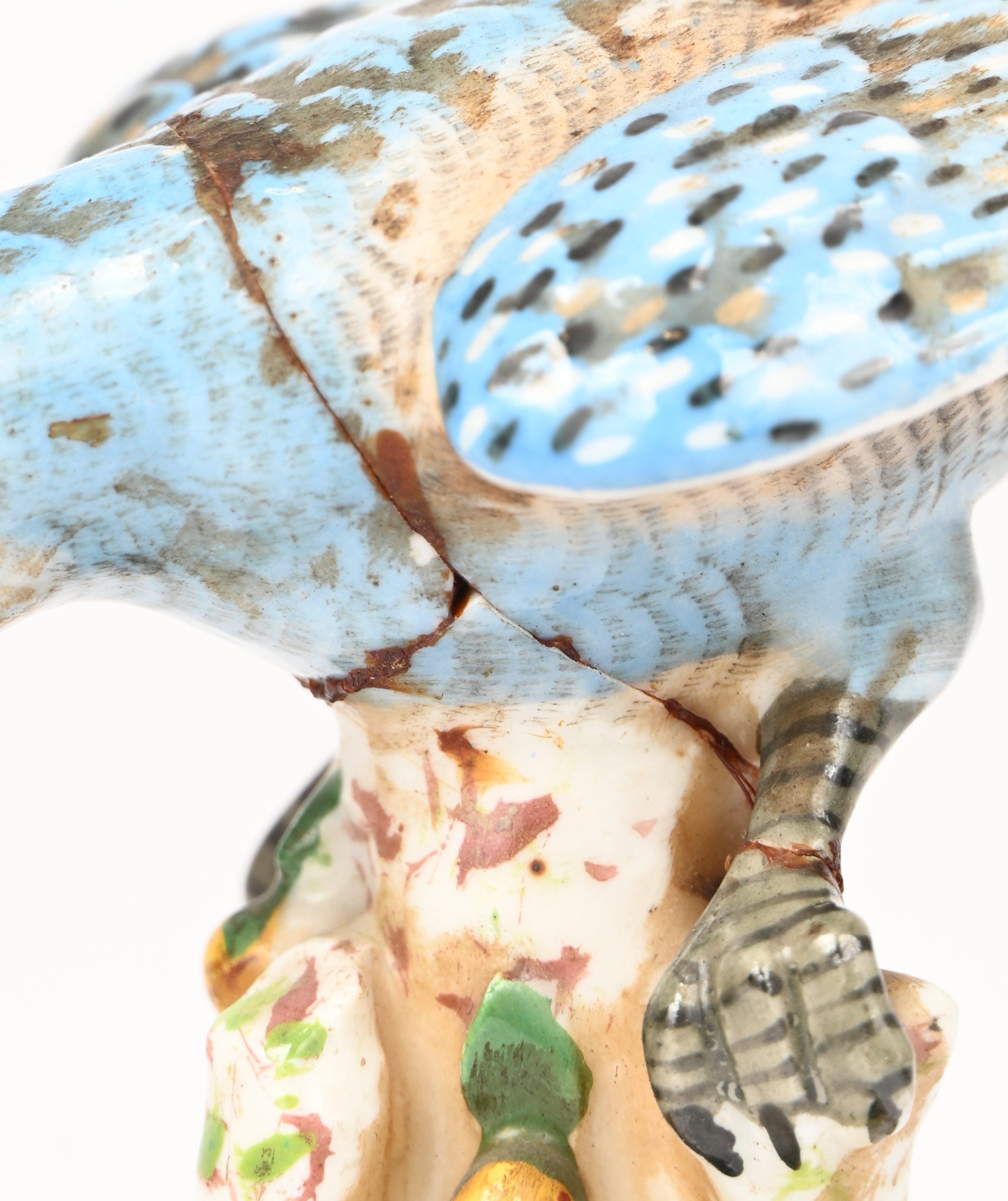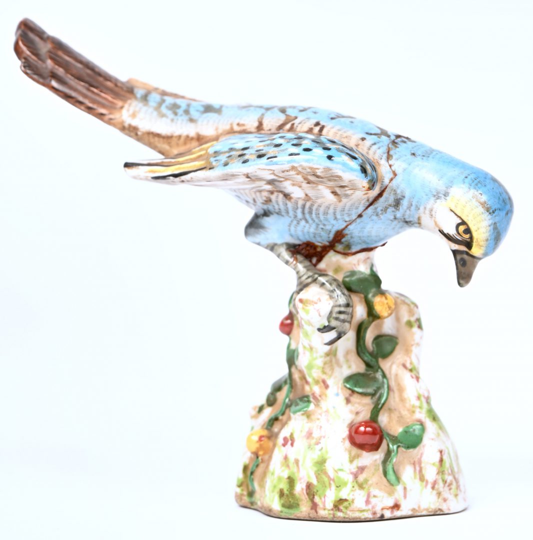 Een porseleinen beeldje van een blauwe parkiet. Gemerkt met gekruiste pijlen. Meermaals gelijmd.