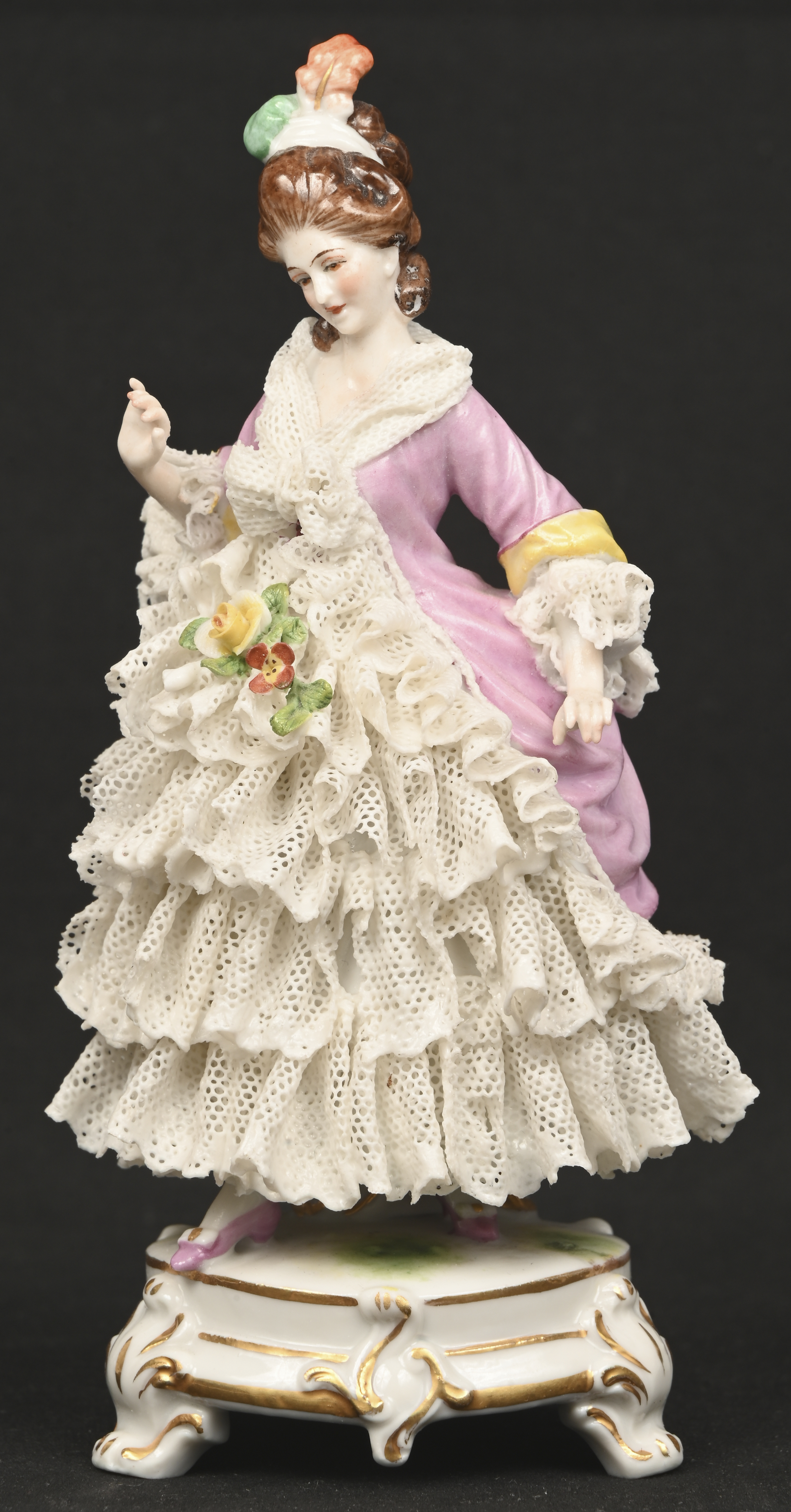 Een opengewerkt porseleinen dekselpotje versierd met bloemen, in de stijl van Capo Di Monte. Met schade.