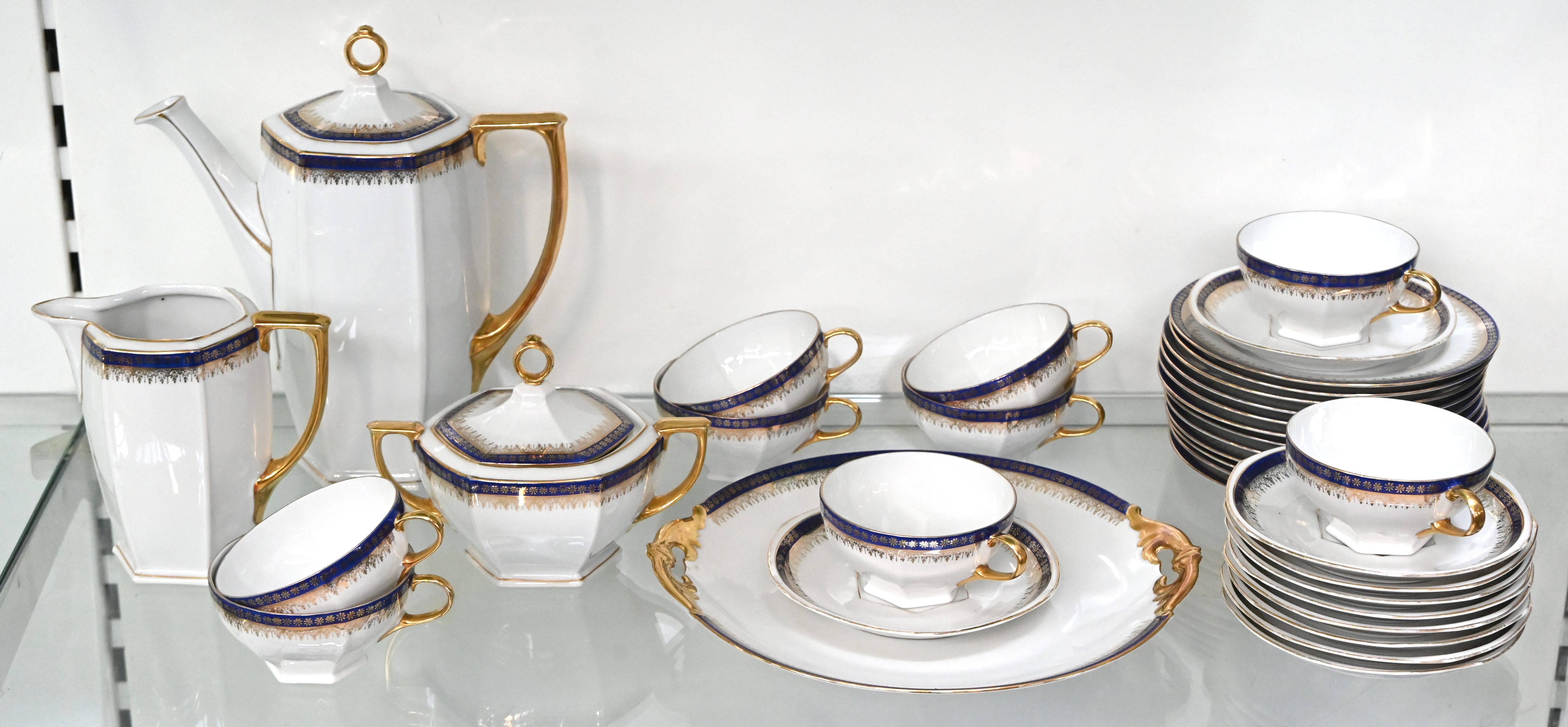 A porcelain dessert service, made in Czechoslovakia, consisting of a teapot, a milk jug, a sugar bowl, 9 cups, 10 saucers, 12 dessert plates, and a platter.